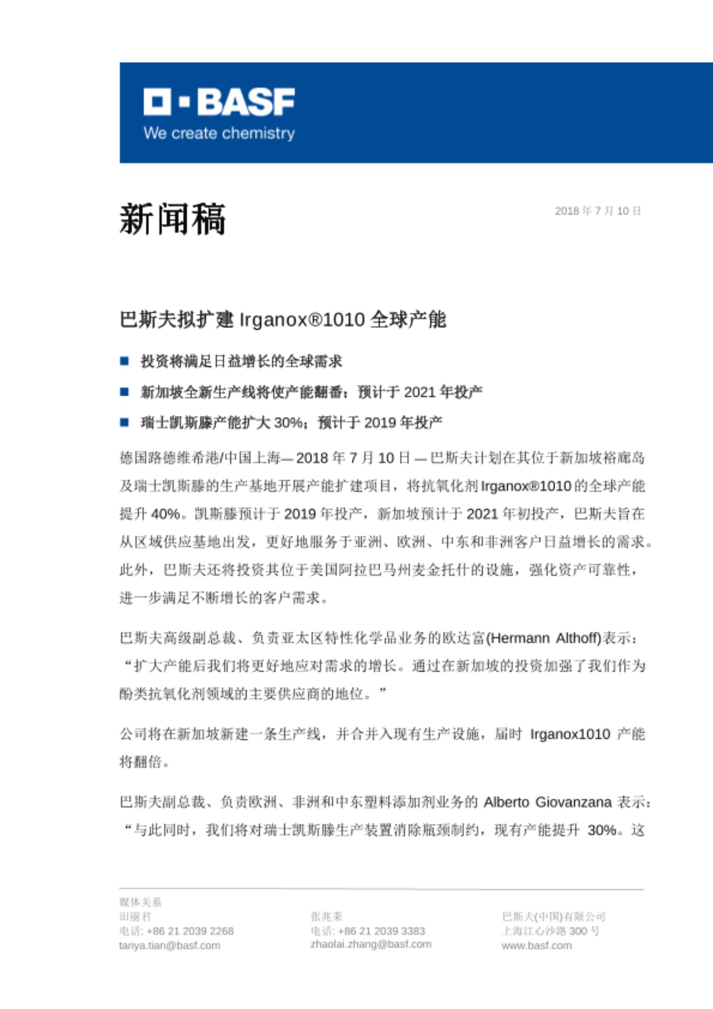 德国路德维希港/中国上海— 2018年7月 10日 — 巴斯夫计划在其位于新加坡裕廊岛及瑞士凯斯滕的生产基地开展产能扩建项目,将抗氧化剂Irganox®1010的全球产能提升40%。凯斯滕预计于2019年投产,新加坡预计于2021年初投产,巴斯夫旨在从区域供应基地出发,更好地服务于亚洲、欧洲、中东和非洲客户日益增长的需求。此外,巴斯夫还将投资其位于美国阿拉巴马州麦金托什的设施,强化资产可靠性,进一步满足不断增长的客户需求。