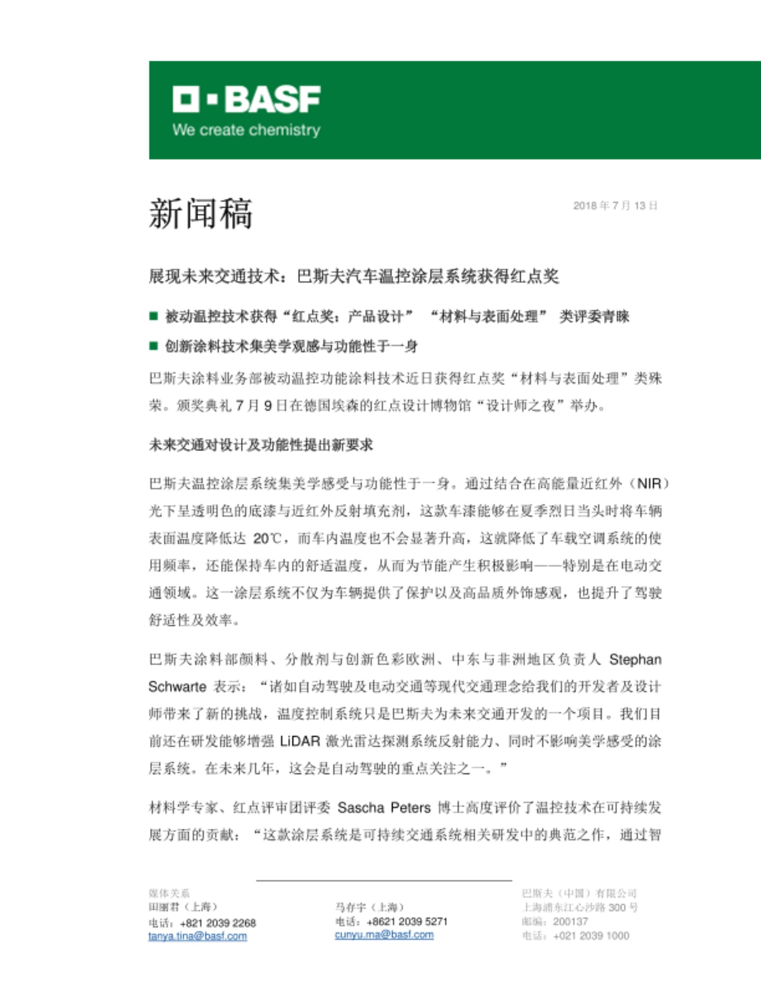 展现未来交通技术:巴斯夫汽车温控涂层系统获得红点奖