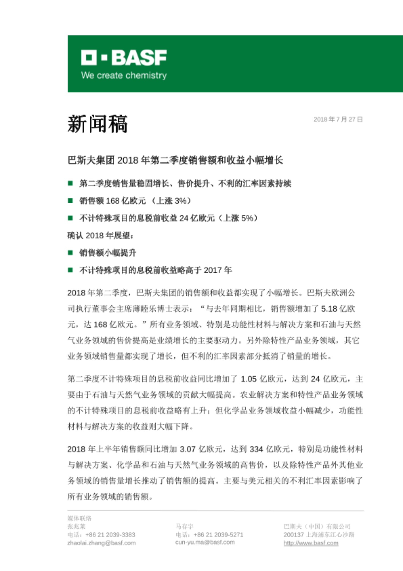 鉴于目前的市场表现,薄睦乐补充道:“受地缘政治发展和中美两国之间以及美国与欧洲之间贸易争端的影响,2018年上半年全球经济风险急剧上升。我们正密切关注这些趋势及对巴斯夫业务带来的潜在影响。