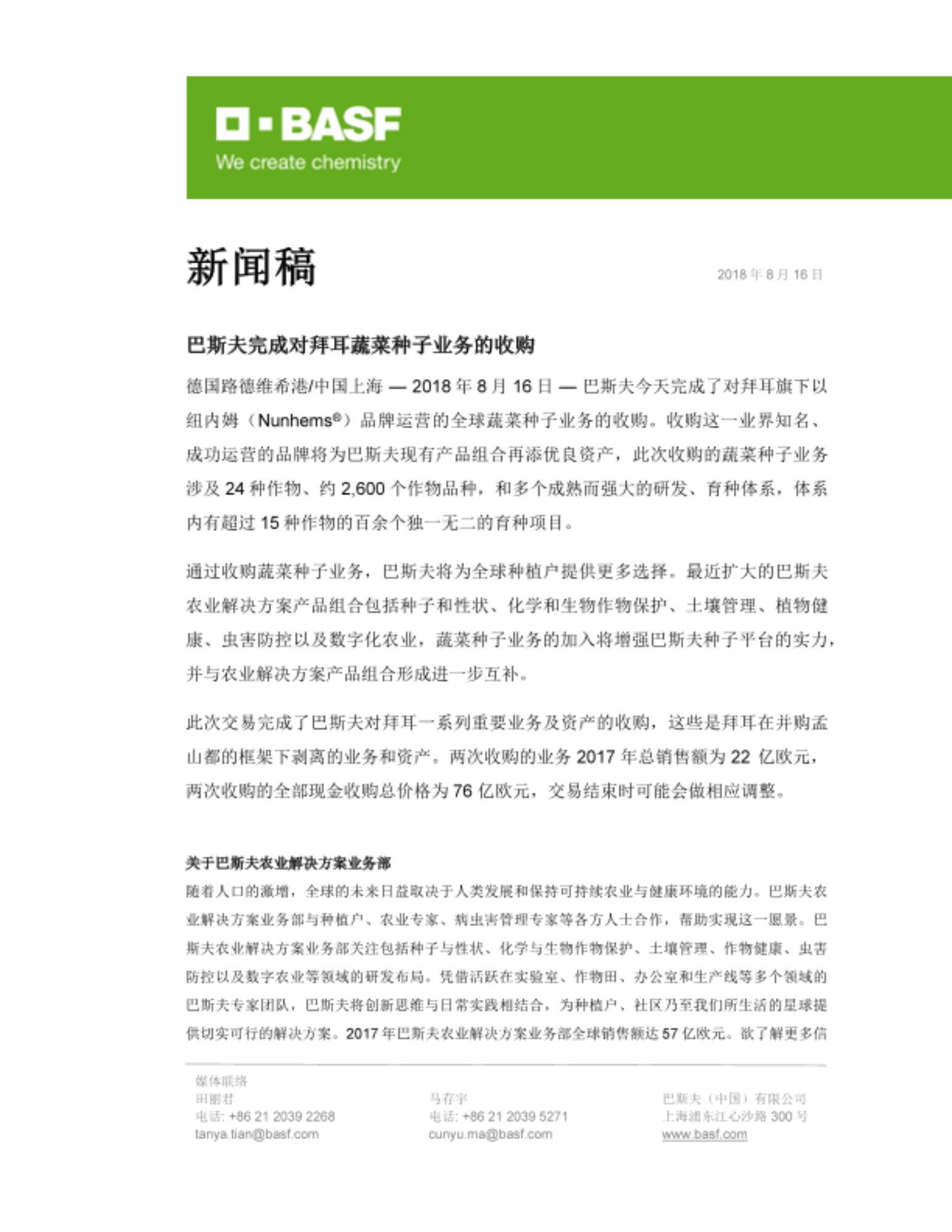 德国路德维希港/中国上海 — 2018年8月16日 — 巴斯夫今天完成了对拜耳旗下以纽内姆(Nunhems®)品牌运营的全球蔬菜种子业务的收购。收购这一业界知名、成功运营的品牌将为巴斯夫现有产品组合再添优良资产,此次收购的蔬菜种子业务涉及24种作物、约2,600个作物品种,和多个成熟而强大的研发、育种体系,体系内有超过15种作物的百余个独一无二的育种项目。