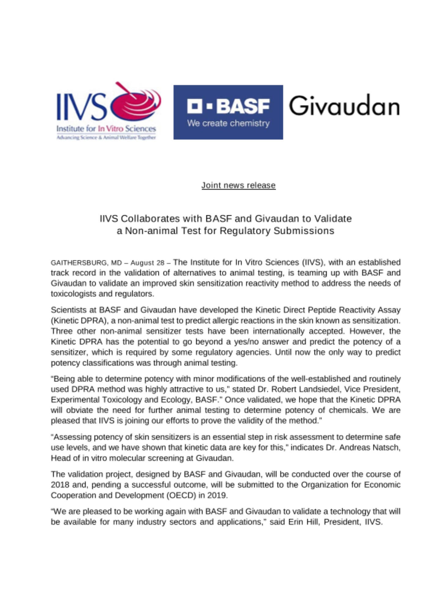 马里兰州盖瑟斯堡/中国上海 — 9月13日 — 美国体外科学研究院(IIVS)在动物试验替代方法验证领域拥有良好口碑。该研究院正与巴斯夫和奇华顿开展合作,对一种经过改良的皮肤致敏性反应测试方法进行验证,以满足毒理学家和监管机构的要求。