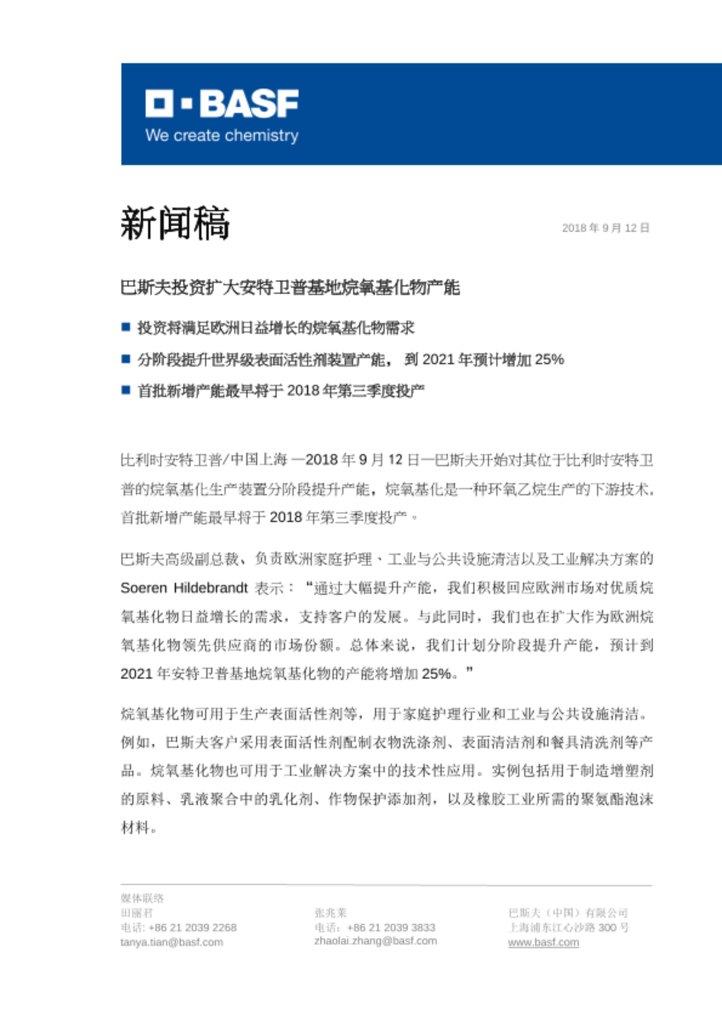 比利时安特卫普/中国上海 —2018年9月12日—巴斯夫开始对其位于比利时安特卫普的烷氧基化生产装置分阶段提升产能,烷氧基化是一种环氧乙烷生产的下游技术,首批新增产能最早将于2018年第三季度投产。
