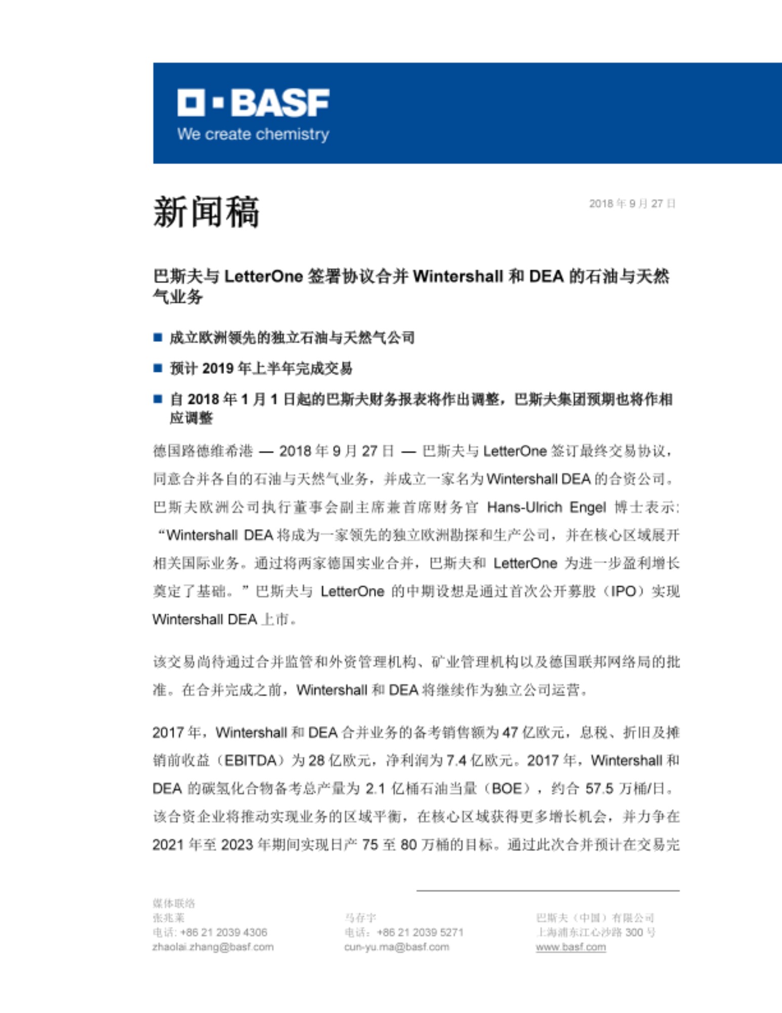 德国路德维希港 — 2018年9月27日 — 巴斯夫与LetterOne签订最终交易协议,同意合并各自的石油与天然气业务,并成立一家名为Wintershall DEA的合资公司。巴斯夫欧洲公司执行董事会副主席兼首席财务官Hans-Ulrich Engel博士表示:“Wintershall DEA将成为一家领先的独立欧洲勘探和生产公司,并在核心区域展开相关国际业务。通过将两家德国实业合并,巴斯夫和LetterOne为进一步盈利增长奠定了基础。”巴斯夫与LetterOne的中期设想是通过首次公开募股(IPO)实现Wintershall DEA上市。