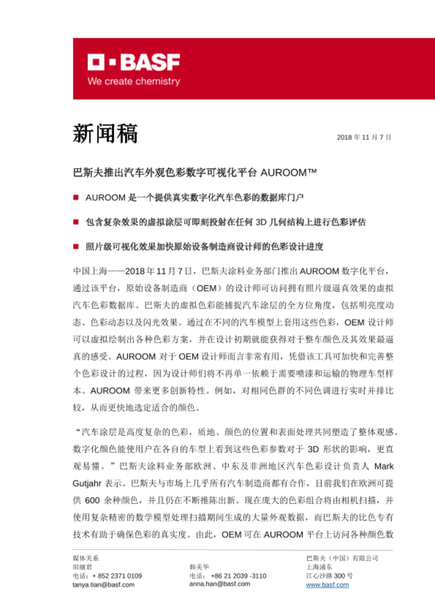 中国上海——2018年11月7日,巴斯夫涂料业务部门推出 AUROOM 数字化平台,通过该平台,原始设备制造商(OEM)的设计师可访问拥有照片级逼真效果的虚拟汽车色彩数据库。巴斯夫的虚拟色彩能捕捉汽车涂层的全方位角度,包括明亮度动态、色彩动态以及闪光效果。通过在不同的汽车模型上套用这些色彩,OEM设计师可以虚拟绘制出各种色彩方案,并在设计初期就能获得对于整车颜色及其效果最逼真的感受。AUROOM 对于OEM设计师而言非常有用,凭借该工具可加快和完善整个色彩设计的过程,因为设计师们将不再单一依赖于需要喷漆和运输的物理车型样本。AUROOM 带来更多创新特性。例如,对相同色群的不同色调进行实时并排比较,从而更快地选定适合的颜色。