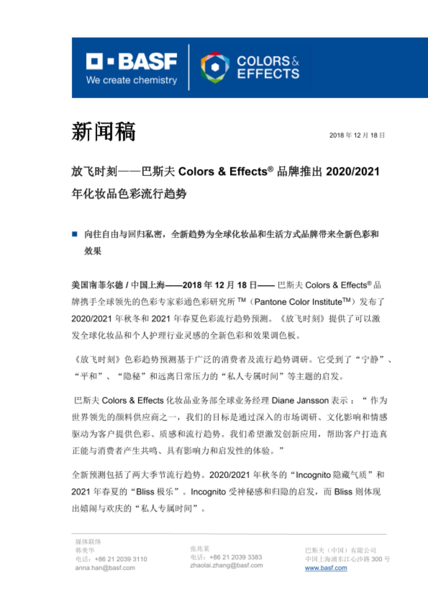 美国南菲尔德 / 中国上海——2018年12月18日—— 巴斯夫Colors & Effects® 品牌携手全球领先的色彩专家彩通色彩研究所TM(Pantone Color InstituteTM)发布了 2020/2021 年秋冬和 2021 年春夏色彩流行趋势预测。《放飞时刻》提供了可以激发全球化妆品和个人护理行业灵感的全新色彩和效果调色板。