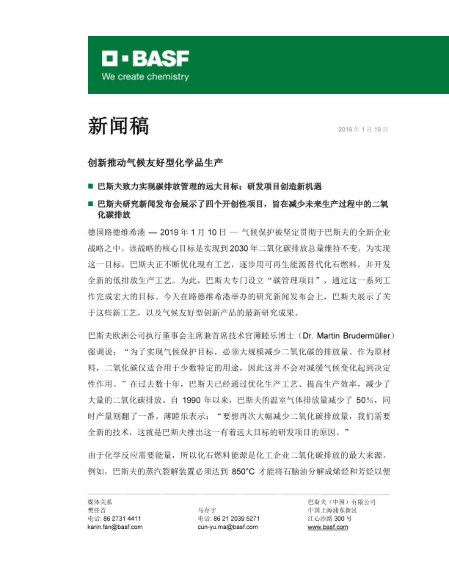 - 巴斯夫致力实现碳排放管理的远大目标;研发项目创造新机遇