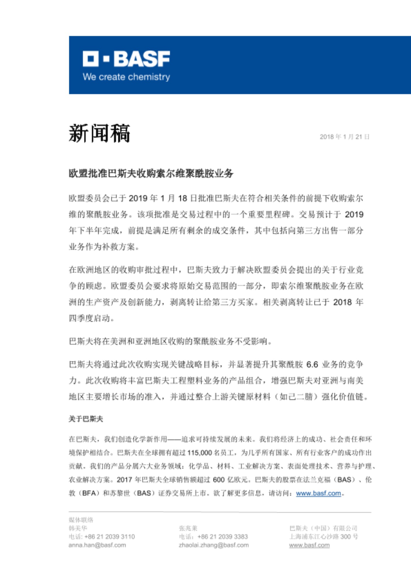 欧盟委员会已于 2019 年 1 月 18 日批准巴斯夫在符合相关条件的前提下收购索尔维的聚酰胺业务。该项批准是交易过程中的一个重要里程碑。交易预计于 2019 年下半年完成,前提是满足所有剩余的成交条件,其中包括向第三方出售一部分业务作为补救方案。