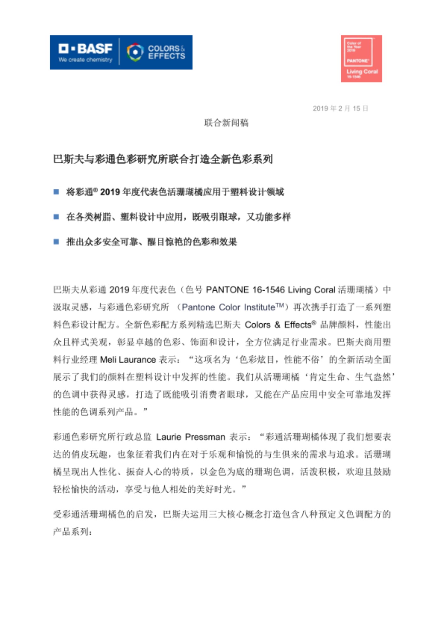 巴斯夫从彩通 2019年度代表色(色号 PANTONE 16-1546 Living Coral活珊瑚橘)中汲取灵感,与彩通色彩研究所 (Pantone Color InstituteTM)再次携手打造了一系列塑料色彩设计配方。全新色彩配方系列精选巴斯夫Colors & Effects® 品牌颜料,性能出众且样式美观,彰显卓越的色彩、饰面和设计,全方位满足行业需求。巴斯夫商用塑料行业经理 Meli Laurance 表示:“这项名为‘色彩炫目,性能不俗’的全新活动全面展示了我们的颜料在塑料设计中发挥的性能。我们从活珊瑚橘‘肯定生命、生气盎然’的色调中获得灵感,打造了既能吸引消费者眼球,又能在产品应用中安全可靠地发挥性能的色调系列产品。”