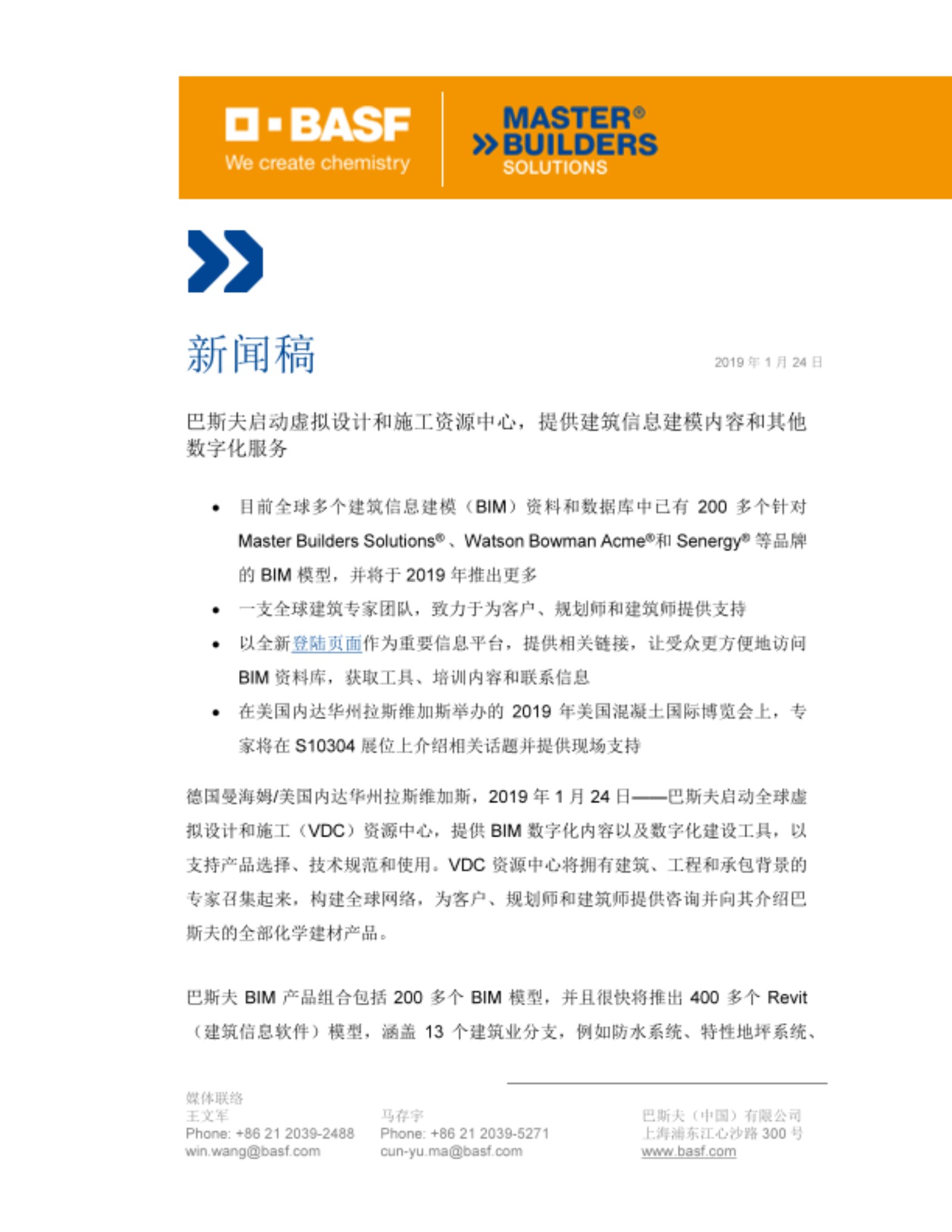 德国曼海姆/美国内达华州拉斯维加斯,2019 年 1 月 24 日——巴斯夫启动全球虚拟设计和施工(VDC)资源中心,提供 BIM 数字化内容以及数字化建设工具,以支持产品选择、技术规范和使用。VDC 资源中心将拥有建筑、工程和承包背景的专家召集起来,构建全球网络,为客户、规划师和建筑师提供咨询并向其介绍巴斯夫的全部化学建材产品。