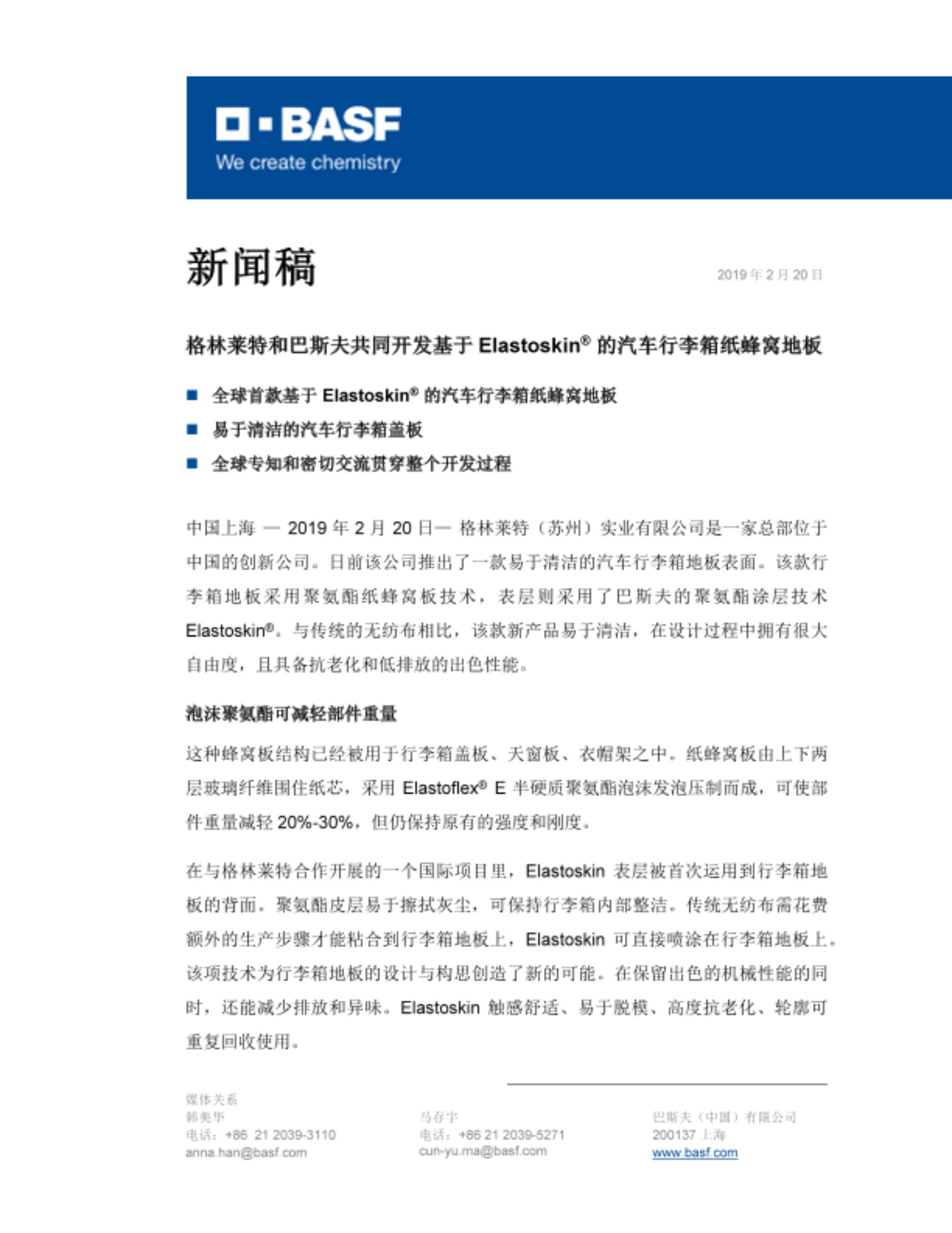 中国上海 — 2019年2月20日— 格林莱特(苏州)实业有限公司是一家总部位于中国的创新公司。日前该公司推出了一款易于清洁的汽车行李箱地板表面。该款行李箱地板采用聚氨酯纸蜂窝板技术,表层则采用了巴斯夫的聚氨酯涂层技术Elastoskin®。与传统的无纺布相比,该款新产品易于清洁,在设计过程中拥有很大自由度,且具备抗老化和低排放的出色性能。
