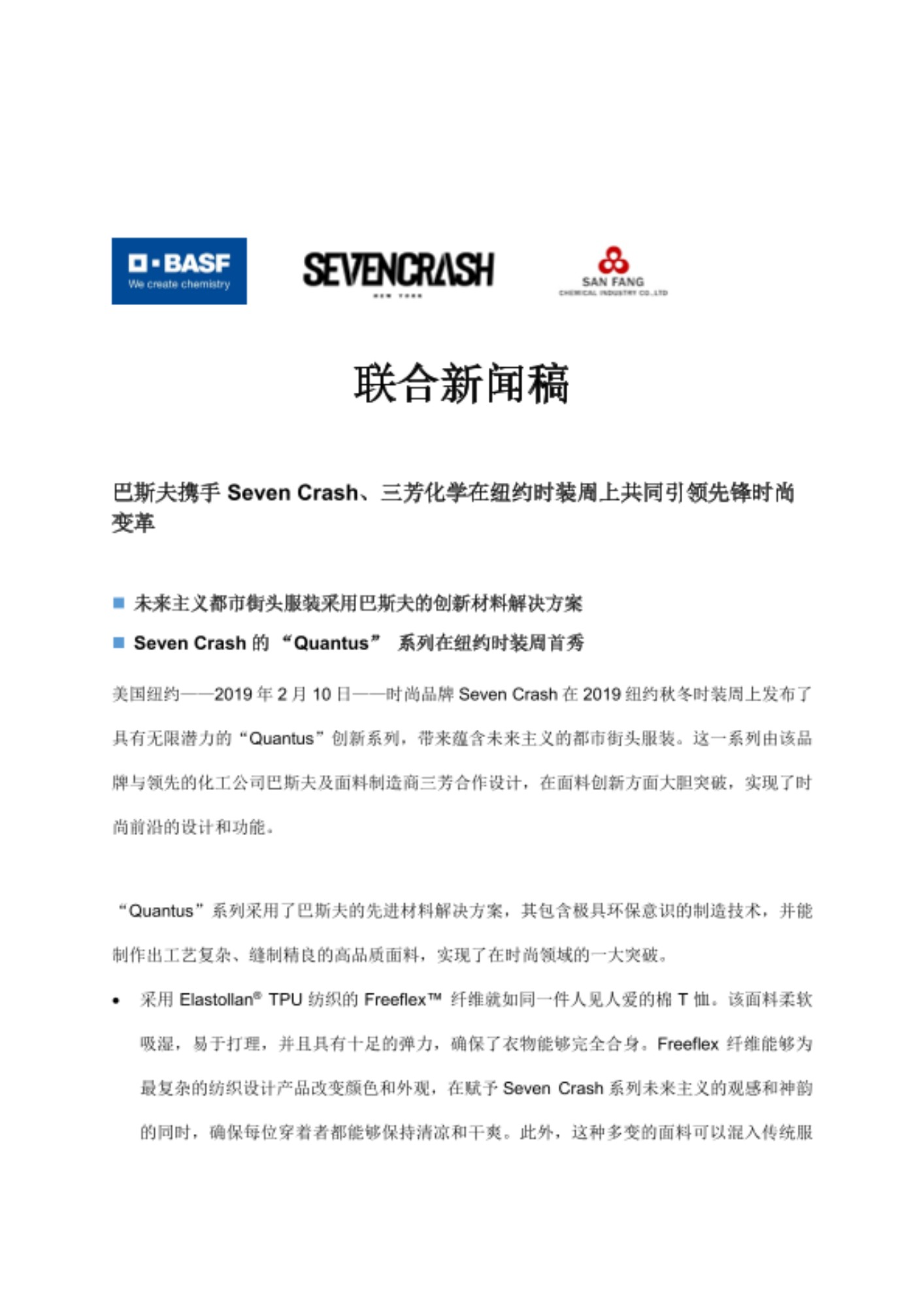 Seven Crash之前就与巴斯夫合作为CHINAPLAS 2018国际橡塑展上的时装秀设计服装。他们还与中国品牌三枪合作,用Freeflex设计家居服。巴斯夫将继续与Seven Crash合作,共同推进面向未来的环保和创新的服装面料。