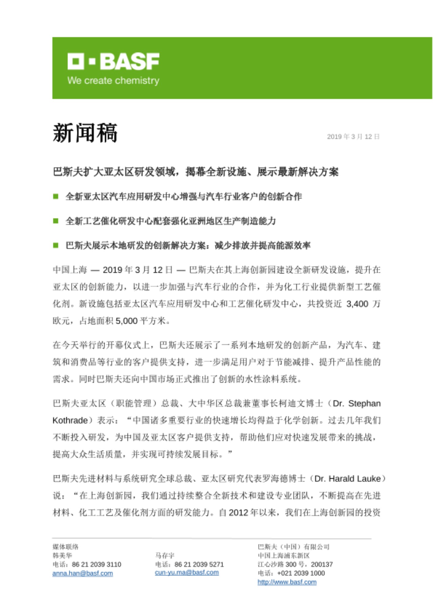 中国上海 — 2019年3月12日 — 巴斯夫在其上海创新园建设全新研发设施,提升在亚太区的创新能力,以进一步加强与汽车行业的合作,并为化工行业提供新型工艺催化剂。新设施包括亚太区汽车应用研发中心和工艺催化研发中心,共投资近3,400万欧元,占地面积5,000平方米。