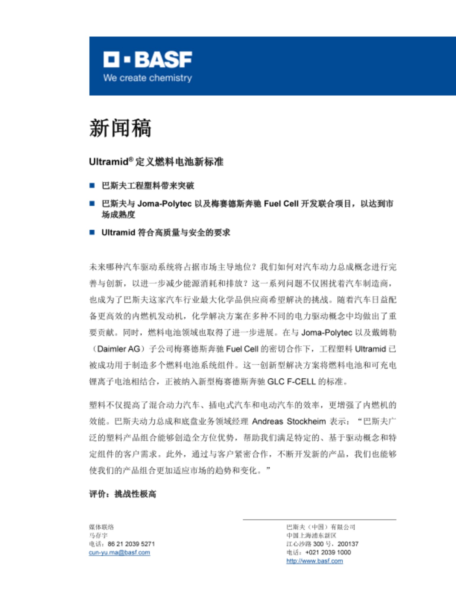 - 巴斯夫与Joma-Polytec以及梅赛德斯奔驰 Fuel Cell开发联合项目,以达到市场成熟度