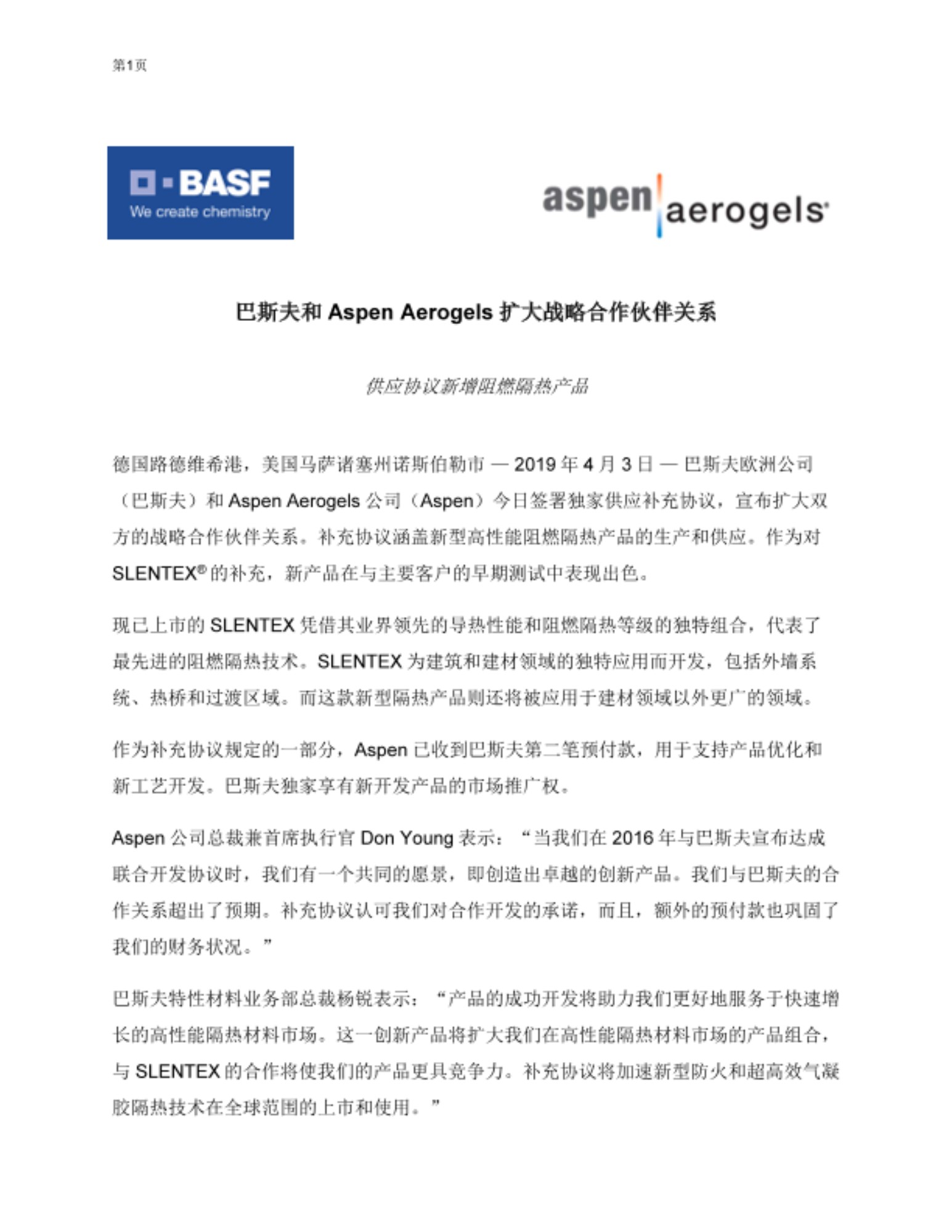 德国路德维希港,美国马萨诸塞州诺斯伯勒市 — 2019年4月3日 — 巴斯夫欧洲公司(巴斯夫)和Aspen Aerogels公司(Aspen)今日签署独家供应补充协议,宣布扩大双方的战略合作伙伴关系。补充协议涵盖新型高性能阻燃隔热产品的生产和供应。作为对SLENTEX® 的补充,新产品在与主要客户的早期测试中表现出色。