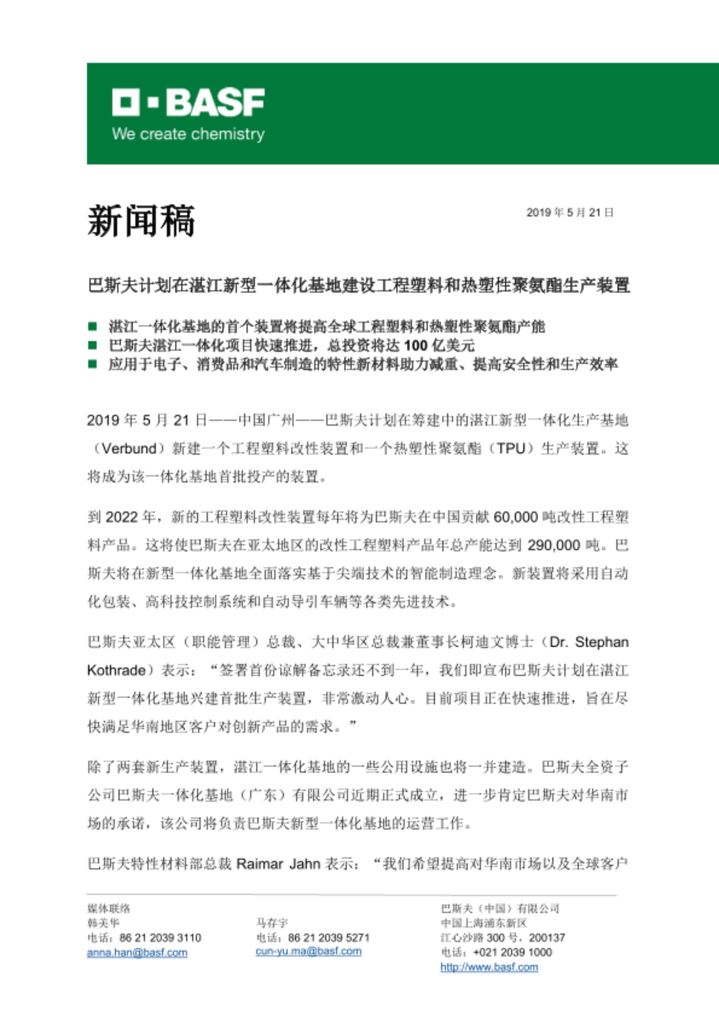 2019年5月21日——中国广州——巴斯夫计划在筹建中的湛江新型一体化生产基地(Verbund)新建一个工程塑料改性装置和一个热塑性聚氨酯(TPU)生产装置。这将成为该一体化基地首批投产的装置。