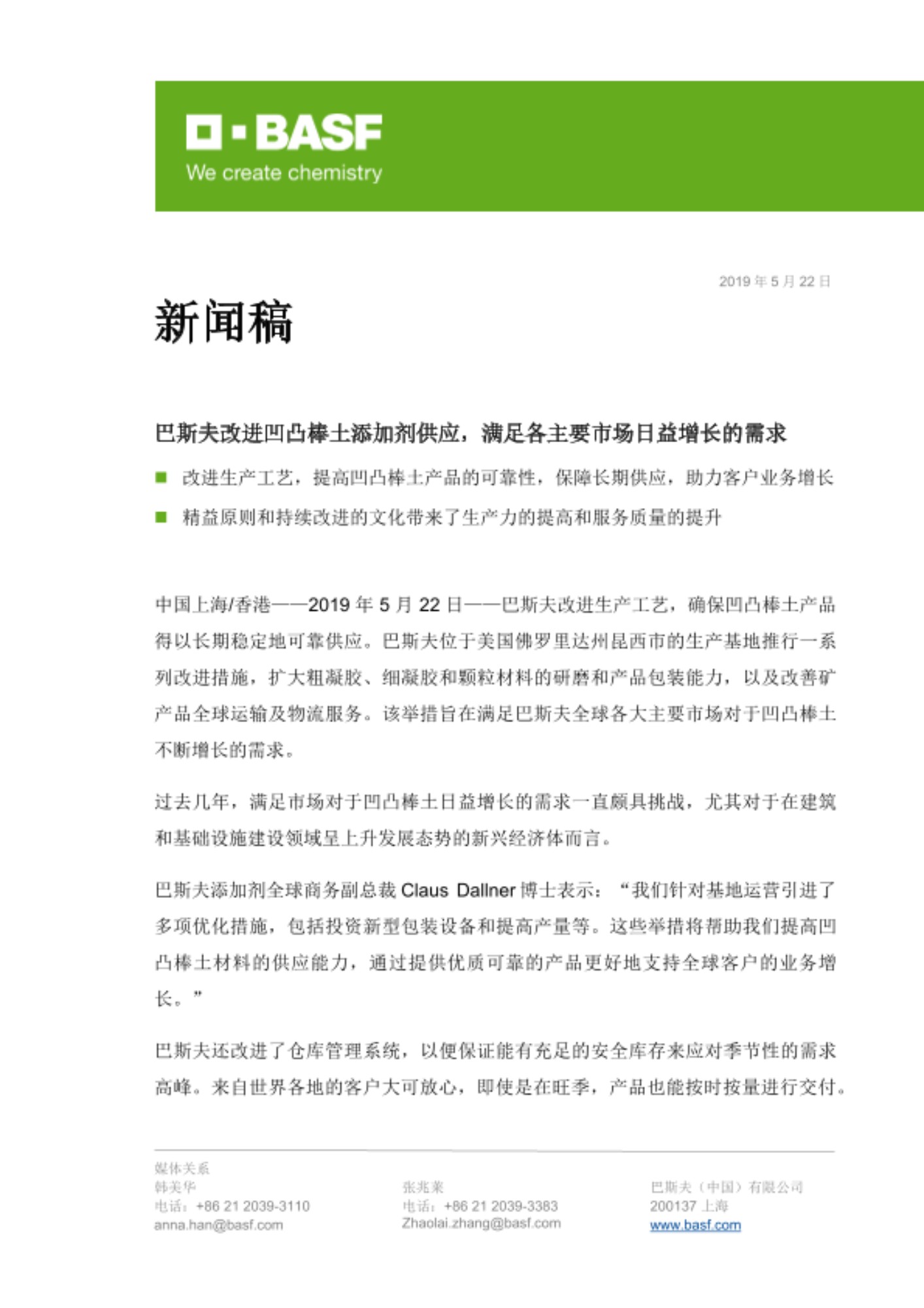 中国上海/香港——2019年5月22日——巴斯夫改进生产工艺,确保凹凸棒土产品得以长期稳定地可靠供应。巴斯夫位于美国佛罗里达州昆西市的生产基地推行一系列改进措施,扩大粗凝胶、细凝胶和颗粒材料的研磨和产品包装能力,以及改善矿产品全球运输及物流服务。该举措旨在满足巴斯夫全球各大主要市场对于凹凸棒土不断增长的需求。