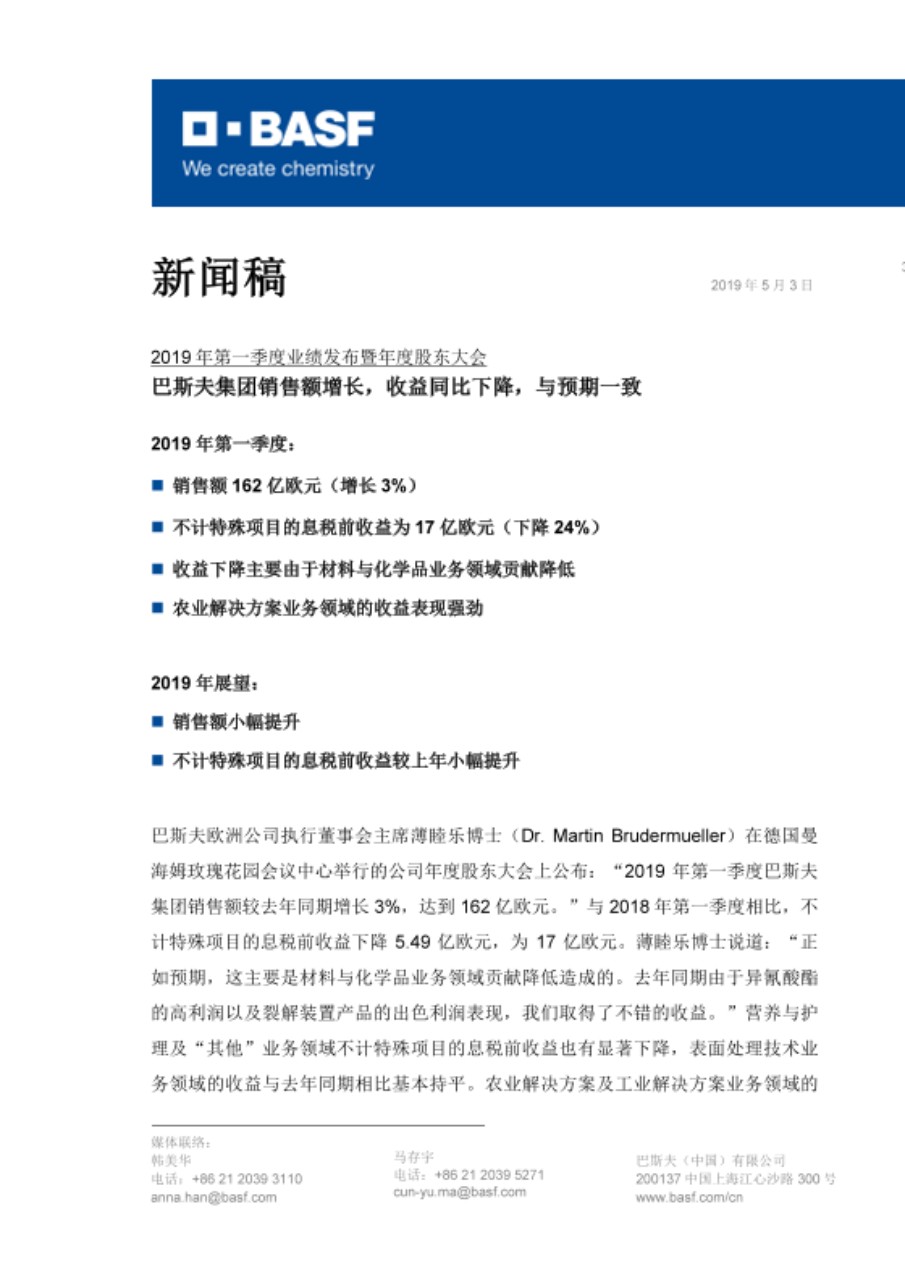 | 巴斯夫集团2019年第一季度报告(北京时间下午1:00起) | |