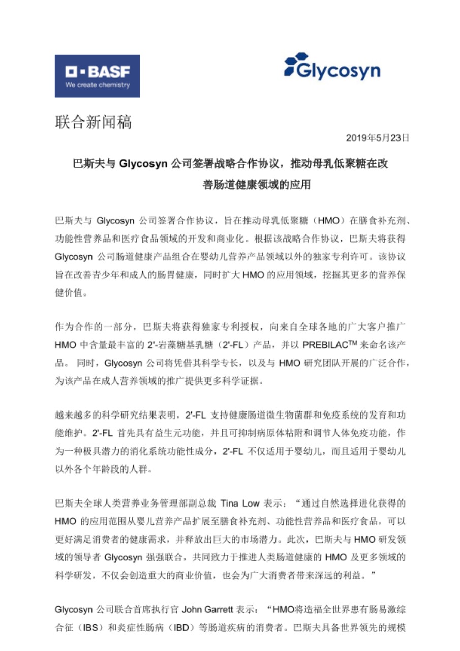 巴斯夫与 Glycosyn 公司签署战略合作协议,推动母乳低聚糖在改善肠道健康领域的应用