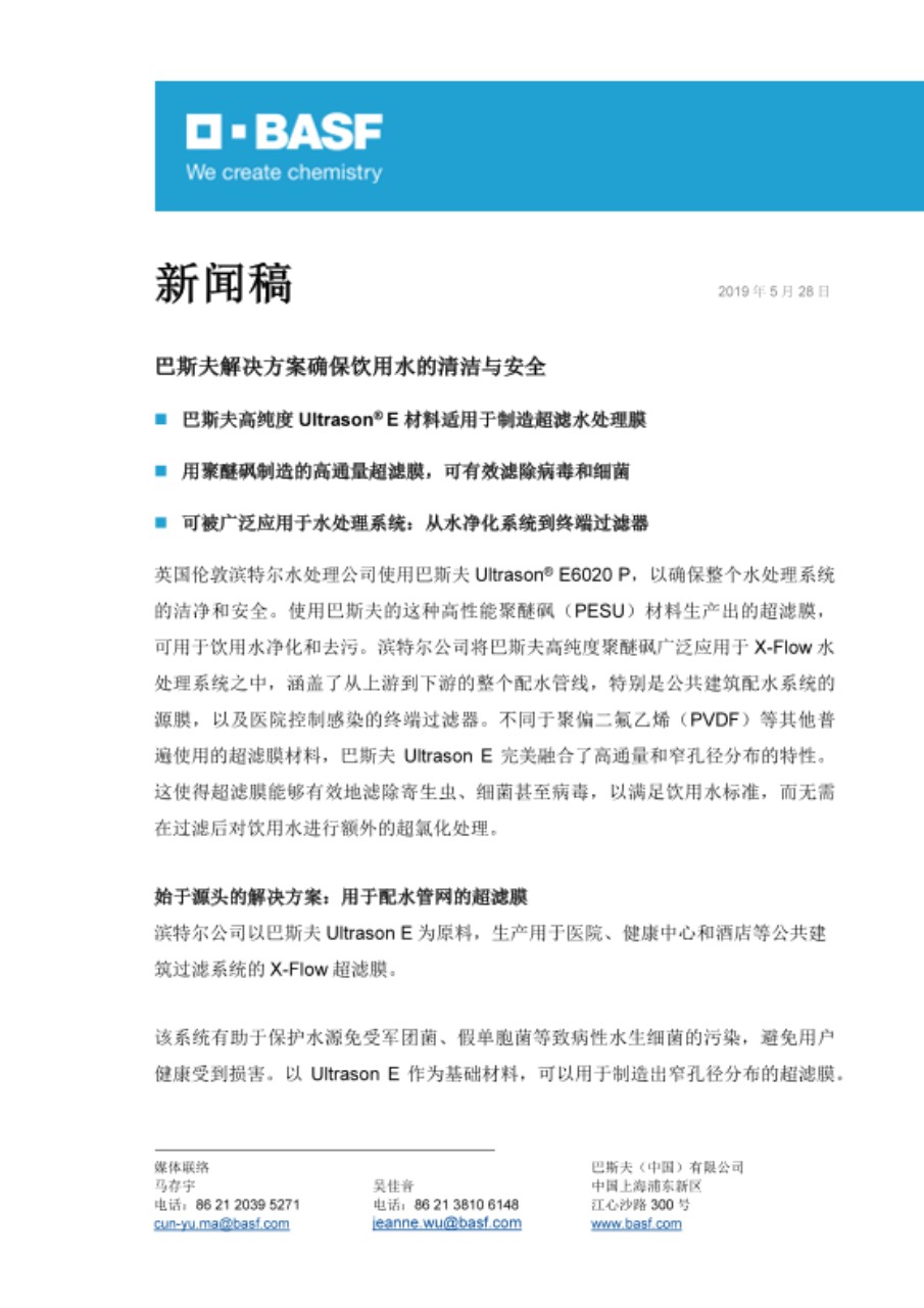 英国伦敦滨特尔水处理公司使用巴斯夫Ultrason® E6020 P,以确保整个水处理系统的洁净和安全。使用巴斯夫的这种高性能聚醚砜(PESU)材料生产出的超滤膜,可用于饮用水净化和去污。滨特尔公司将巴斯夫高纯度聚醚砜广泛应用于X-Flow水处理系统之中,涵盖了从上游到下游的整个配水管线,特别是公共建筑配水系统的源膜,以及医院控制感染的终端过滤器。不同于聚偏二氟乙烯(PVDF)等其他普遍使用的超滤膜材料,巴斯夫Ultrason E完美融合了高通量和窄孔径分布的特性。这使得超滤膜能够有效地滤除寄生虫、细菌甚至病毒,以满足饮用水标准,而无需在过滤后对饮用水进行额外的超氯化处理。