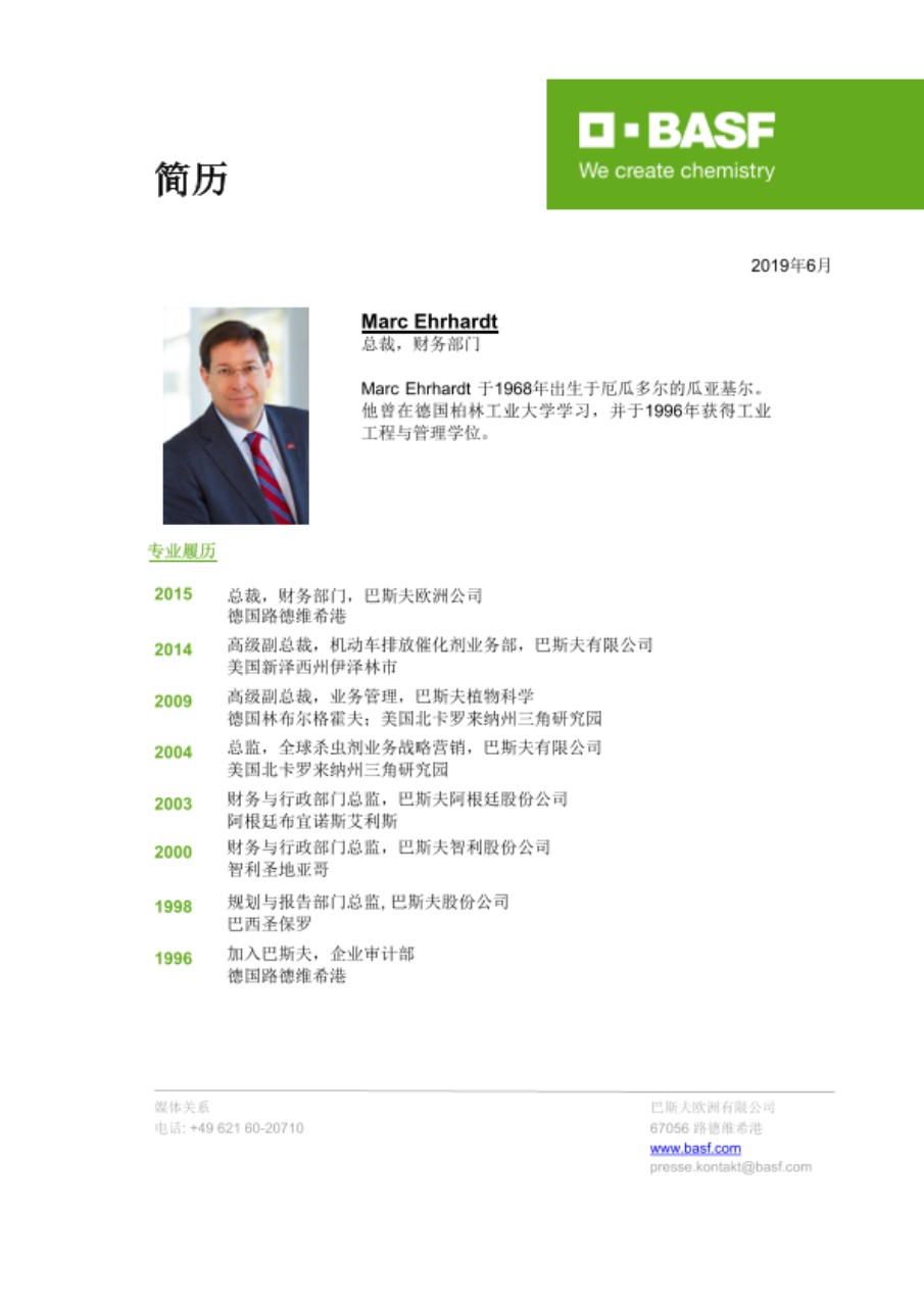 在巴斯夫,我们创造化学新作用——追求可持续发展的未来。我们将经济上的成功、社会责任和环境保护相结合。巴斯夫在全球拥有约122,000名员工,为几乎所有国家、所有行业的客户成功作出贡献。我们的产品分属六大业务领域:化学品、材料、工业解决方案、表面处理技术、营养与护理、农业解决方案。2018年巴斯夫全球销售额约630亿欧元。巴斯夫的股票在法兰克福(BAS)证券交易所上市,并以美国存托凭证(BASFY)的形式在美国证券市场交易。欲了解更多信息,请访问:www.basf.com。