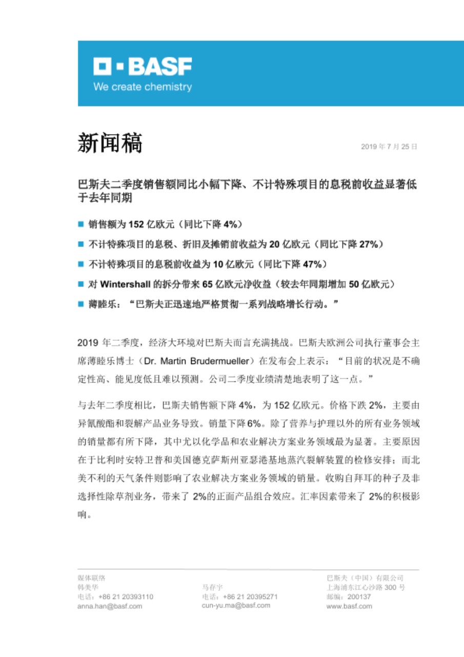 | 巴斯夫集团2019年上半年报告(北京时间下午1点起) | |
