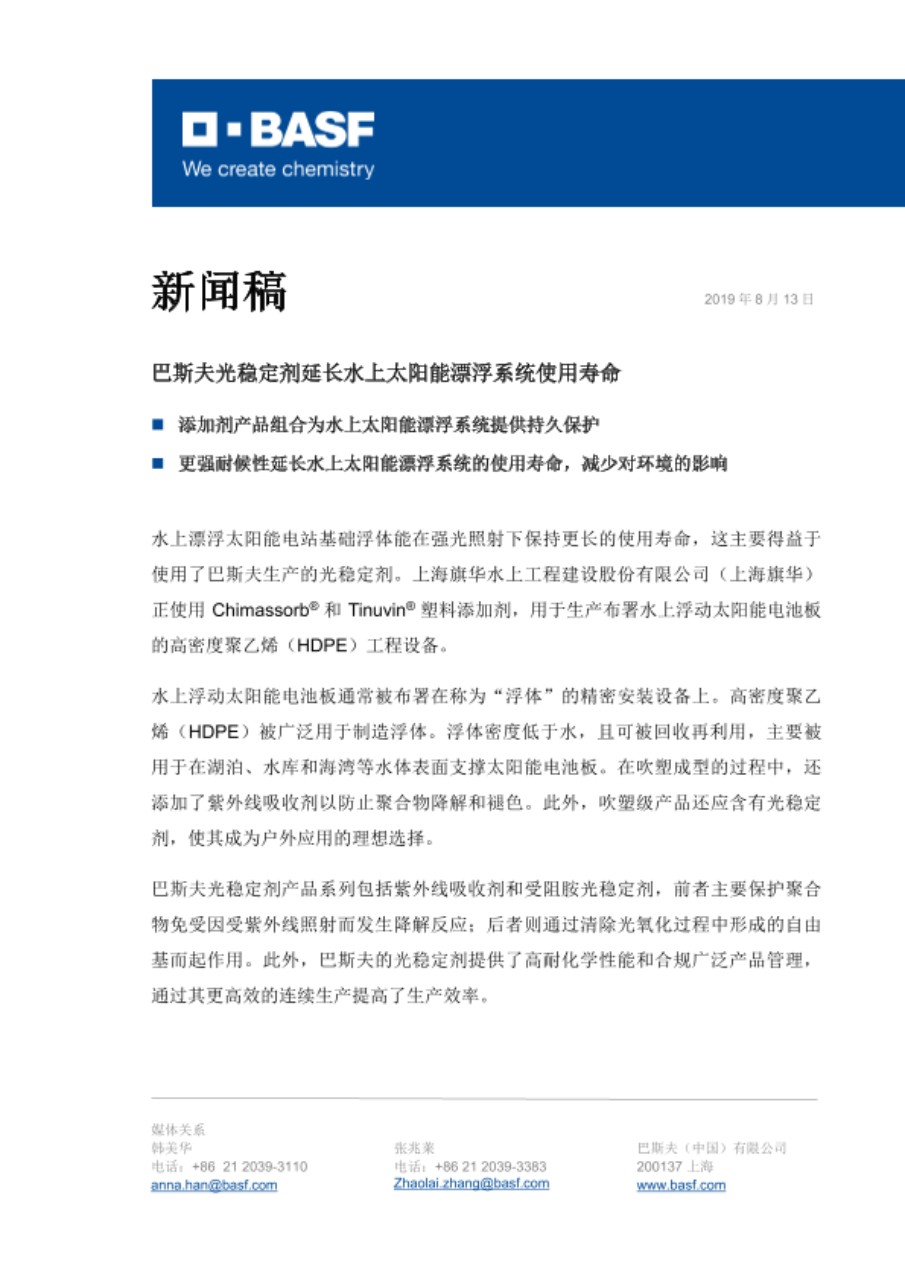 巴斯夫亚太区特性化学品业务部高级副总裁欧达富(Hermann Althoff)表示:“同时使用Tinuvin系列紫外线吸收剂与Chimassorb系列受阻胺光稳定剂能产生协同效应,满足漂浮电站浮体使用年限的设计标准。通过与上海旗华在水上太阳能漂浮系统项目上的合作,我们不仅帮助客户拓展了业务,还通过提高能源利用率,为节约自然资源作出了贡献。”