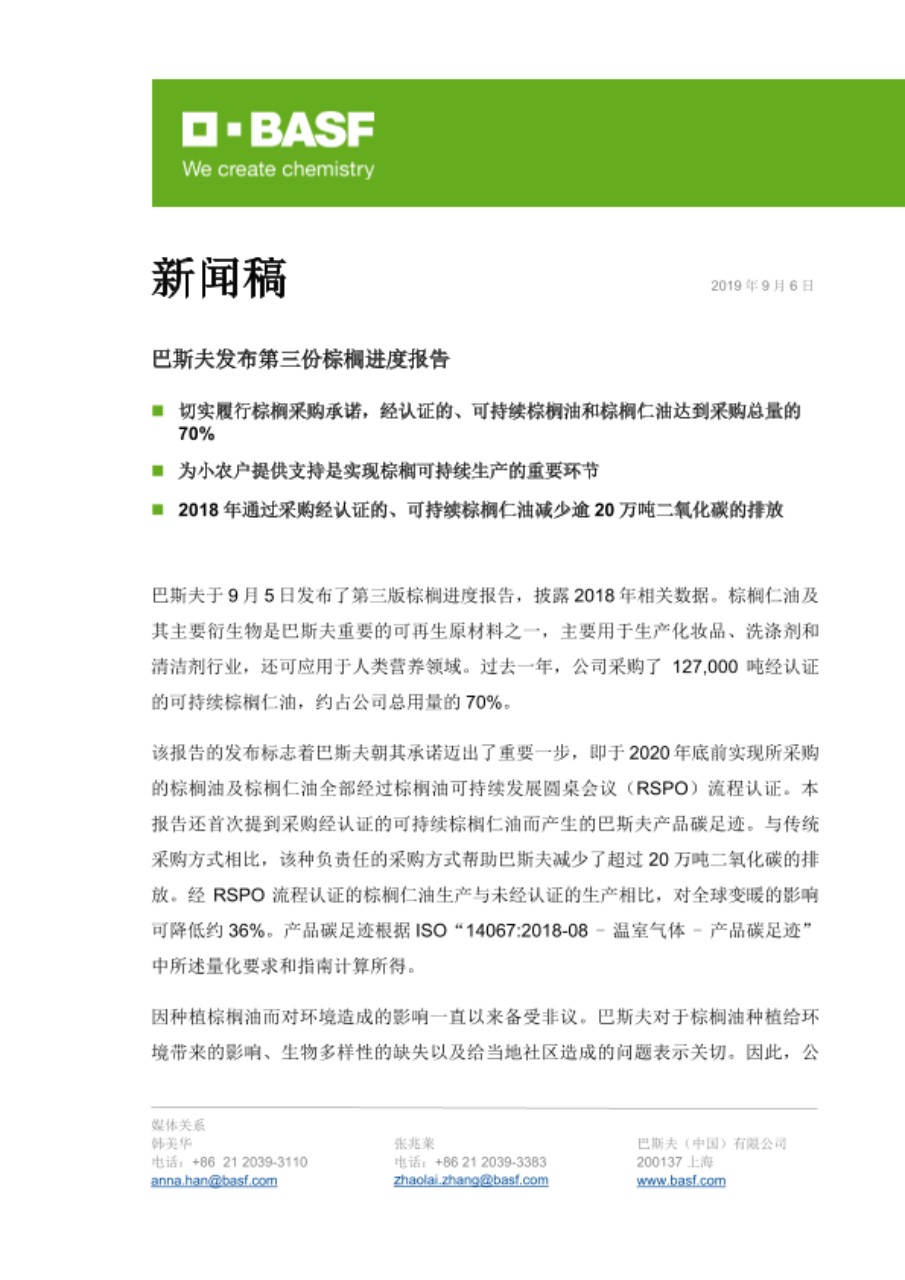 该报告的发布标志着巴斯夫朝其承诺迈出了重要一步,即于2020年底前实现所采购的棕榈油及棕榈仁油全部经过棕榈油可持续发展圆桌会议(RSPO)流程认证。本报告还首次提到采购经认证的可持续棕榈仁油而产生的巴斯夫产品碳足迹。与传统采购方式相比,该种负责任的采购方式帮助巴斯夫减少了超过20万吨二氧化碳的排放。经RSPO流程认证的棕榈仁油生产与未经认证的生产相比,对全球变暖的影响可降低约36%。产品碳足迹根据ISO“14067:2018-08 - 温室气体 - 产品碳足迹”中所述量化要求和指南计算所得。
