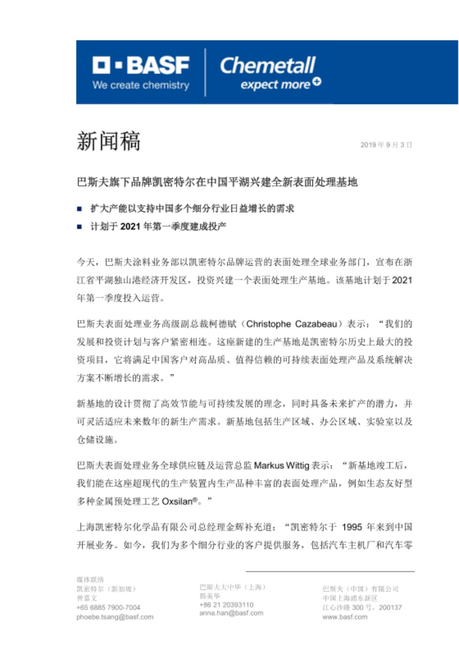 巴斯夫旗下品牌凯密特尔在中国平湖兴建全新表面处理基地