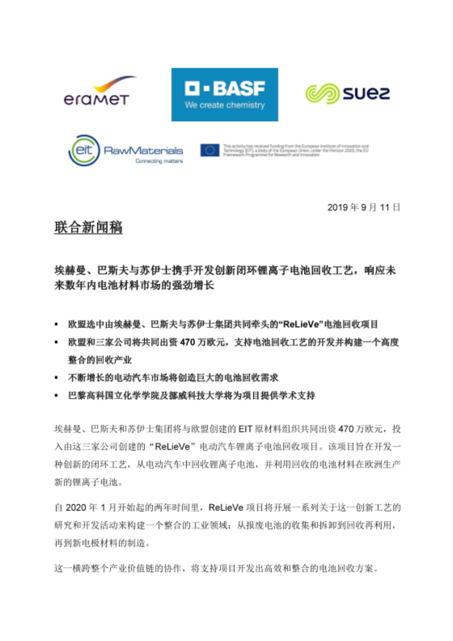 - 欧盟选中由埃赫曼、巴斯夫与苏伊士集团共同牵头的“ReLieVe”电池回收项目