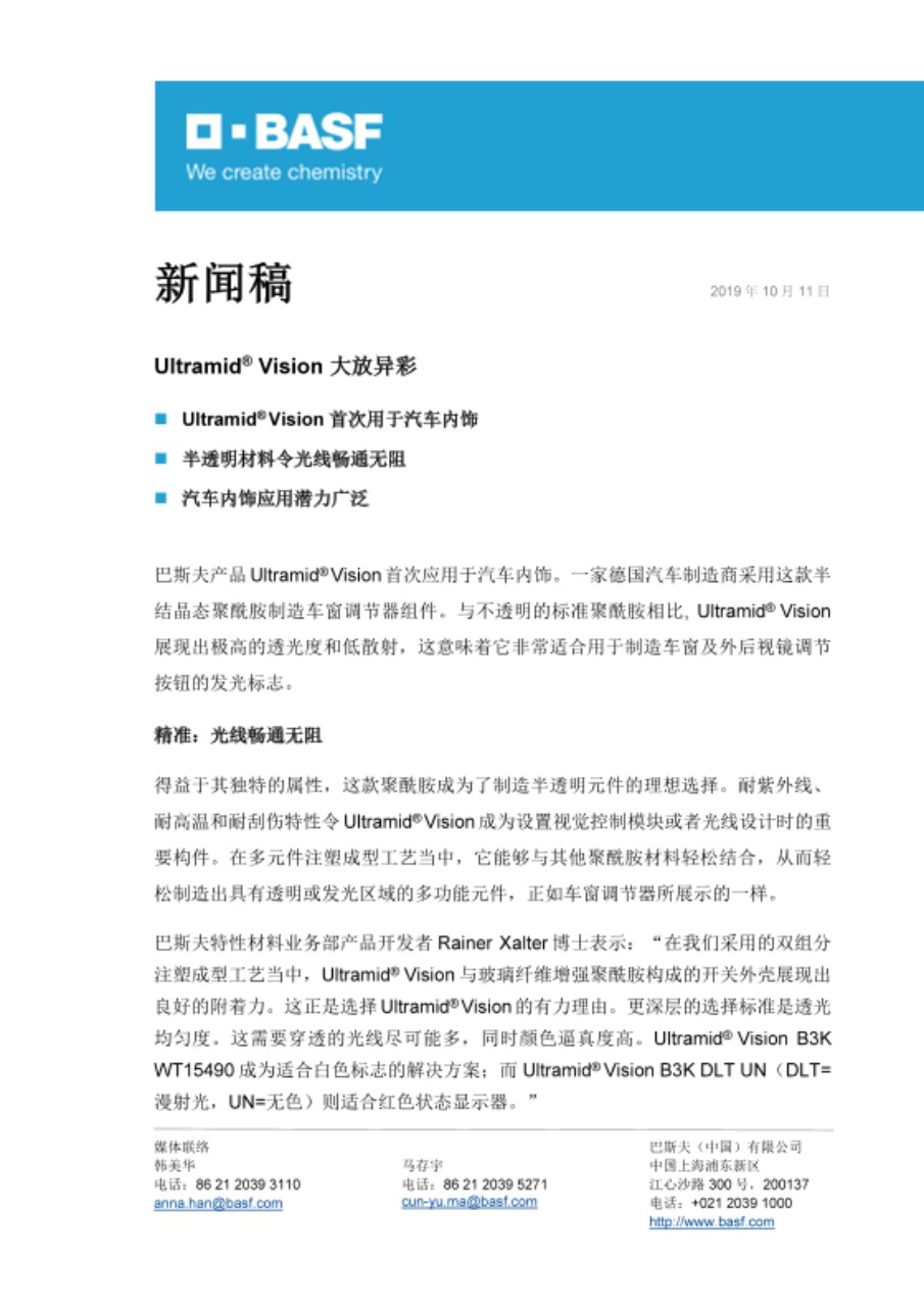 巴斯夫产品Ultramid® Vision首次应用于汽车内饰。一家德国汽车制造商采用这款半结晶态聚酰胺制造车窗调节器组件。与不透明的标准聚酰胺相比, Ultramid® Vision展现出极高的透光度和低散射,这意味着它非常适合用于制造车窗及外后视镜调节按钮的发光标志。