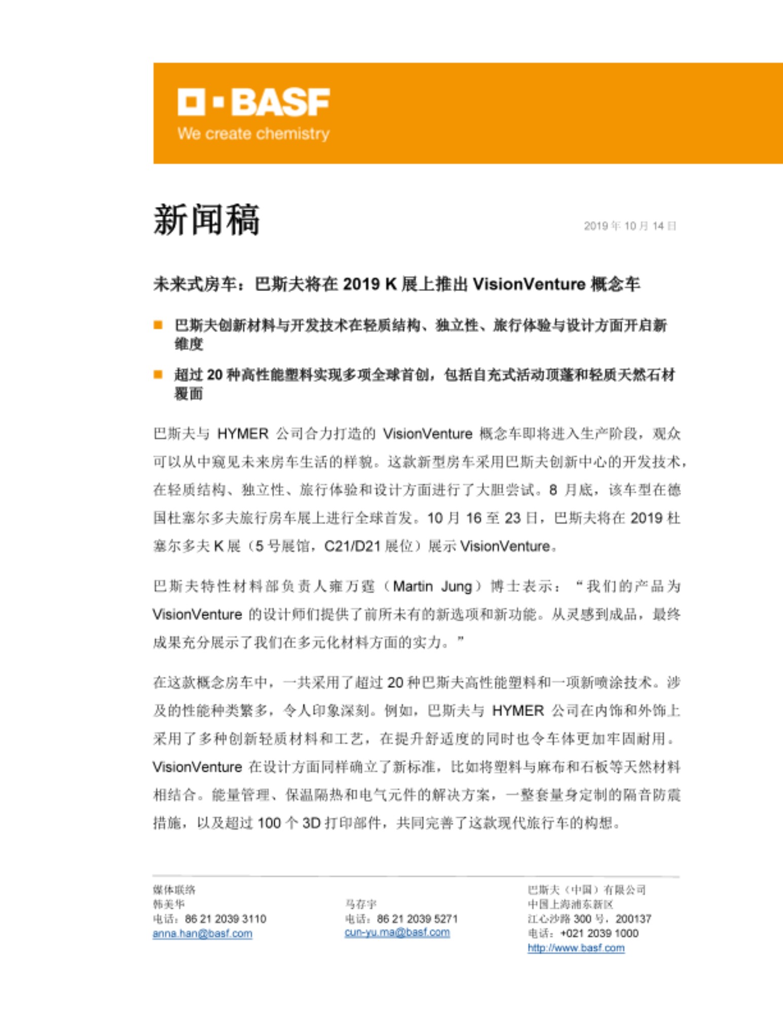 巴斯夫与HYMER公司合力打造的VisionVenture概念车即将进入生产阶段,观众可以从中窥见未来房车生活的样貌。这款新型房车采用巴斯夫创新中心的开发技术,在轻质结构、独立性、旅行体验和设计方面进行了大胆尝试。8月底,该车型在德国杜塞尔多夫旅行房车展上进行全球首发。10月16至23日,巴斯夫将在2019杜塞尔多夫K展(5号展馆,C21/D21展位)展示VisionVenture。