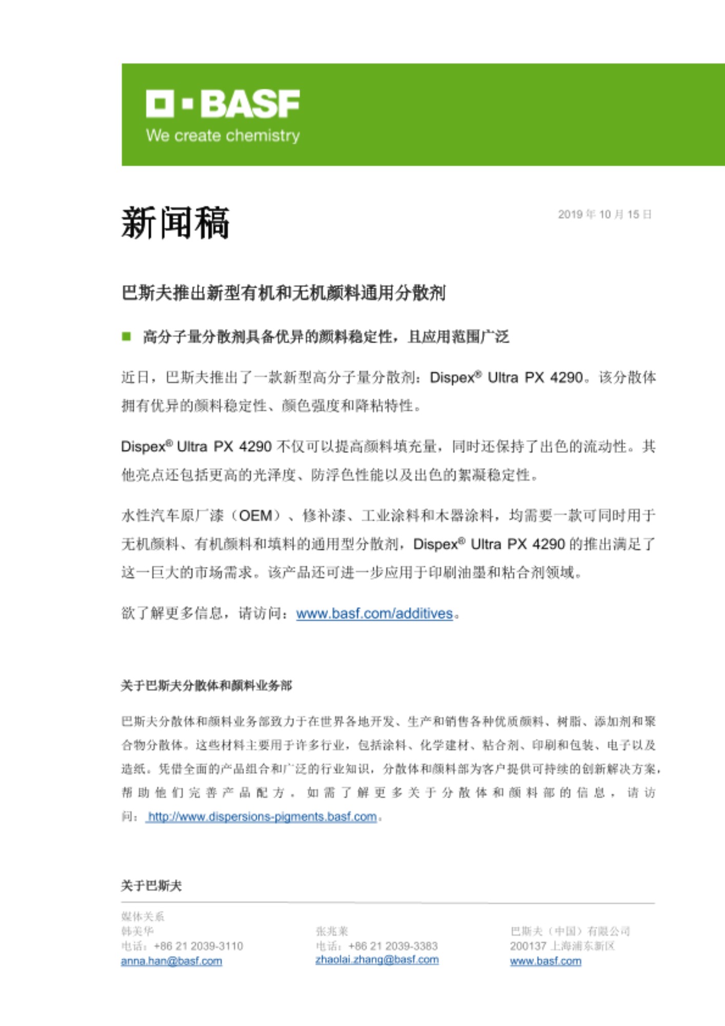 巴斯夫分散体和颜料业务部致力于在世界各地开发、生产和销售各种优质颜料、树脂、添加剂和聚合物分散体。这些材料主要用于许多行业,包括涂料、化学建材、粘合剂、印刷和包装、电子以及造纸。凭借全面的产品组合和广泛的行业知识,分散体和颜料部为客户提供可持续的创新解决方案,帮助他们完善产品配方。如需了解更多关于分散体和颜料部的信息,请访问: http://www.dispersions-pigments.basf.com。