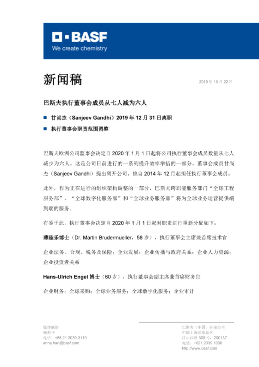 巴斯夫欧洲公司监事会决定自2020年1月1日起将公司执行董事会成员数量从七人减少为六人。这是公司日前进行的一系列提升效率举措的一部分。董事会成员甘尚杰(Sanjeev Gandhi)提出离开公司。他自2014年12月起担任执行董事会成员。
