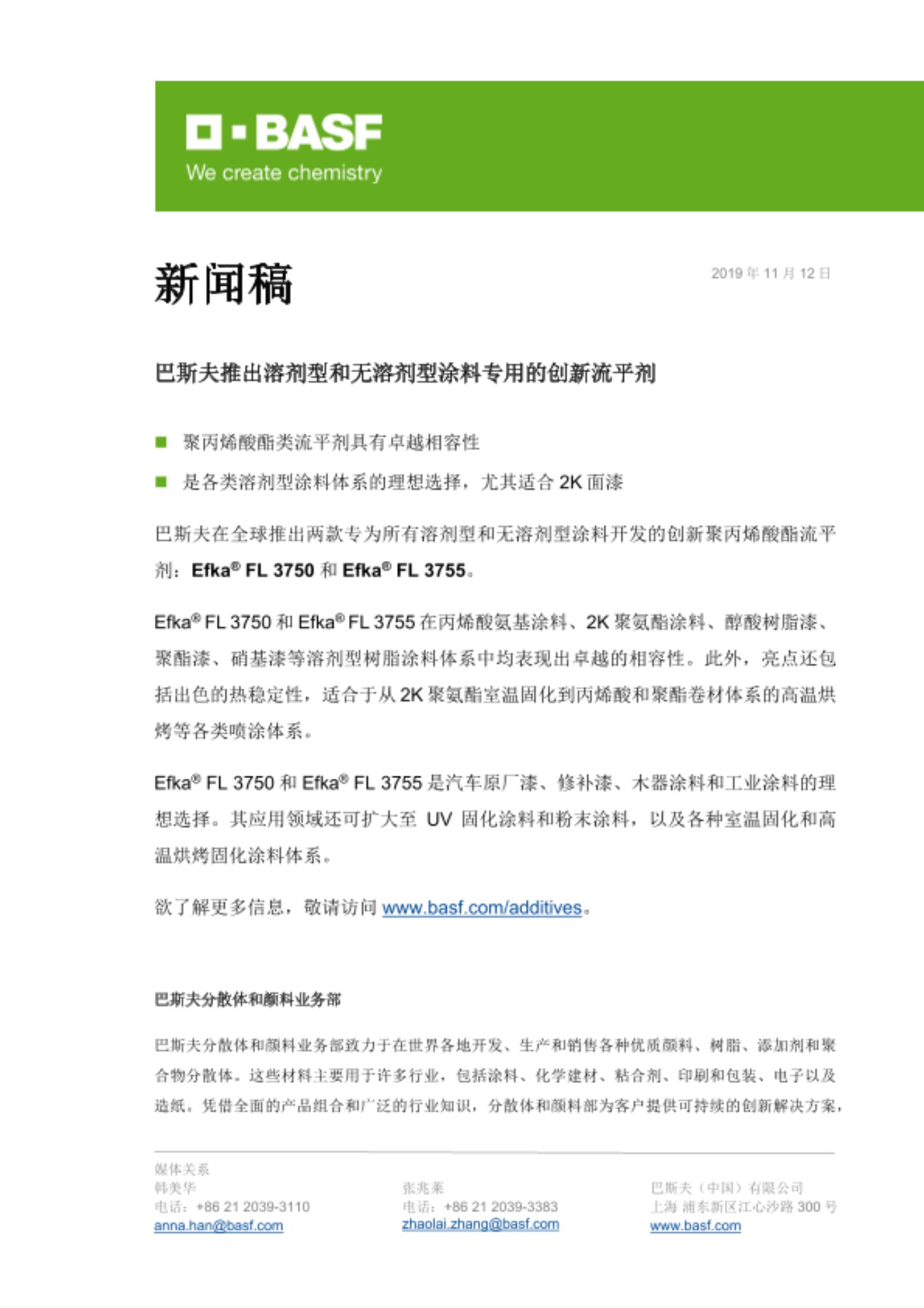 巴斯夫在全球推出两款专为所有溶剂型和无溶剂型涂料开发的创新聚丙烯酸酯流平剂:Efka® FL 3750和Efka® FL 3755。