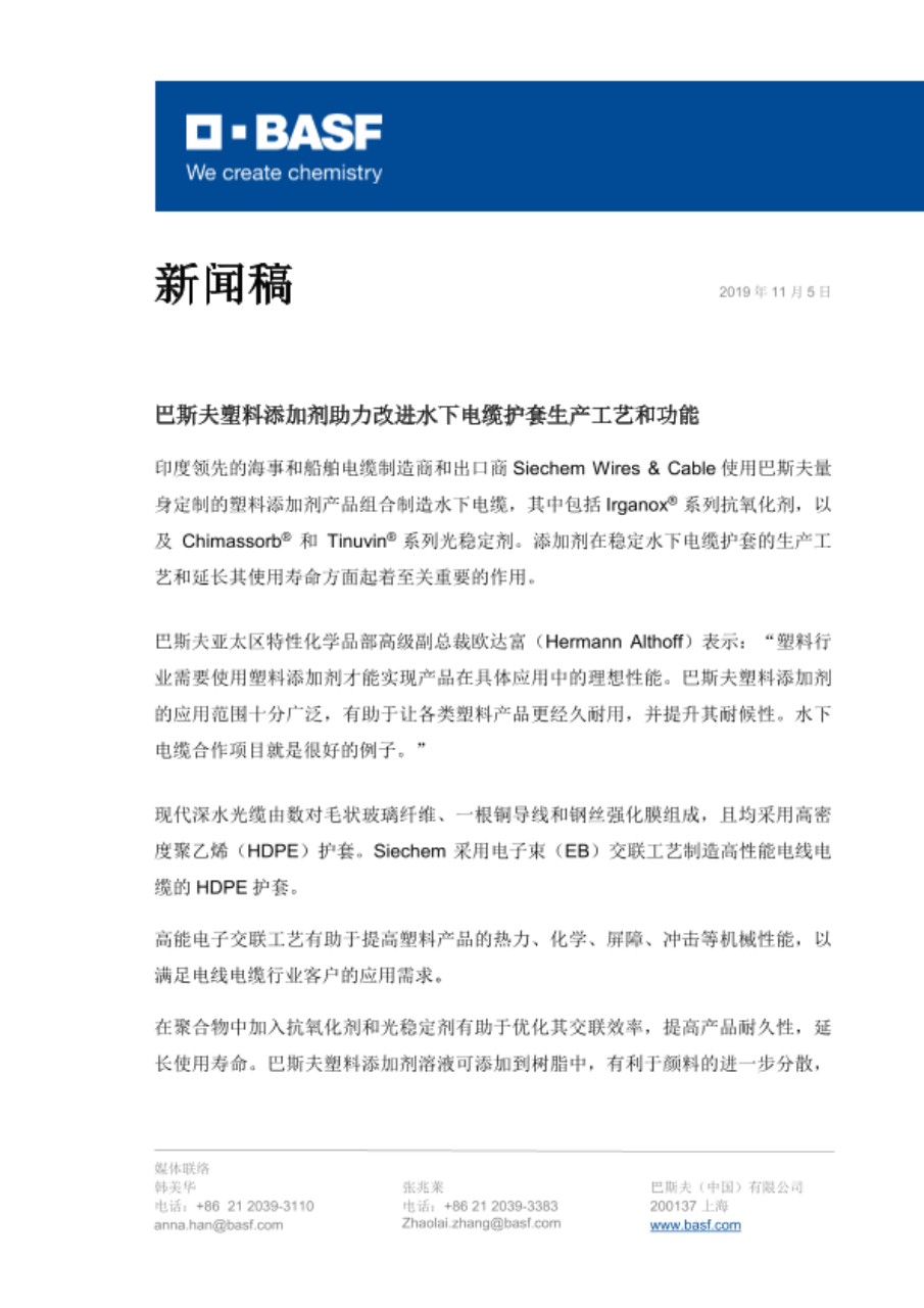 印度领先的海事和船舶电缆制造商和出口商Siechem Wires & Cable使用巴斯夫量身定制的塑料添加剂产品组合制造水下电缆,其中包括Irganox® 系列抗氧化剂,以及Chimassorb® 和Tinuvin® 系列光稳定剂。添加剂在稳定水下电缆护套的生产工艺和延长其使用寿命方面起着至关重要的作用。