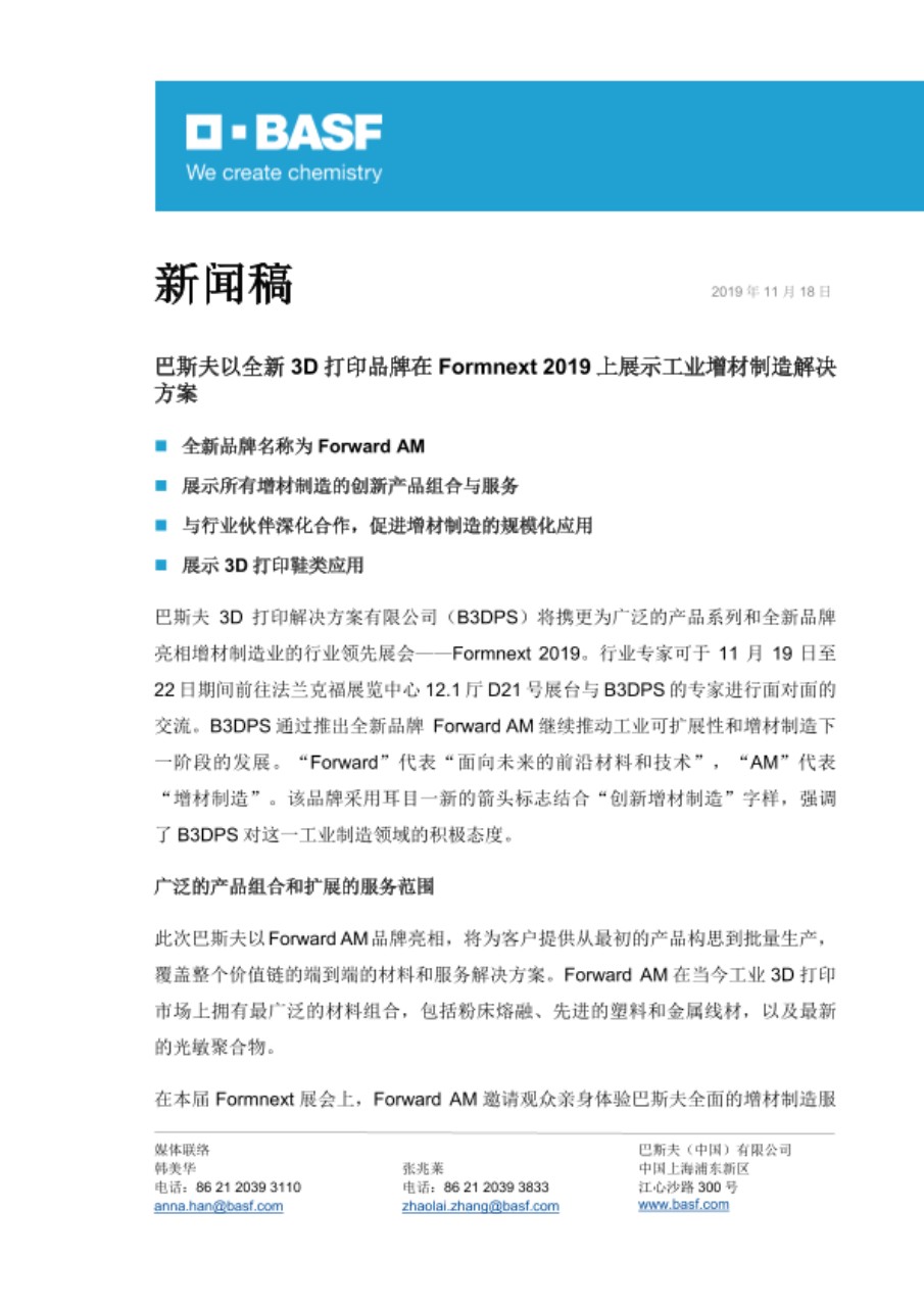 巴斯夫3D打印解决方案有限公司总部位于德国海德堡,是巴斯夫新业责任有限公司的全资子公司。通过Forward AM品牌,专注于建立和拓展3D打印领域的先进材料、系统解决方案、组件和服务的开发和业务拓展。公司凭借灵活、充满初创活力的内部结构,满足多变的3D打印市场中的客户需求。该公司与巴斯夫全球研究平台和应用技术部门紧密合作,以及科研机构、高校、创业公司以及行业合作伙伴开展密切合作。其潜在客户主要是致力于将3D打印用于工业制造的企业,所服务的典型行业包括汽车、航空航天和消费品。欲了解更多信息,请访问:www.forward-am.com。