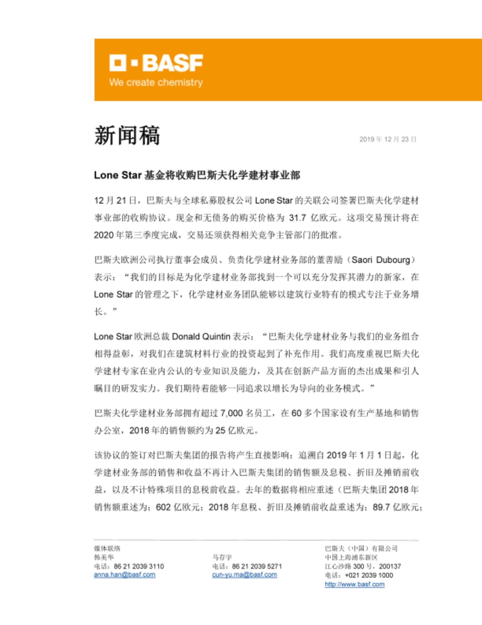 Lone Star欧洲总裁Donald Quintin表示:“巴斯夫化学建材业务与我们的业务组合相得益彰,对我们在建筑材料行业的投资起到了补充作用。我们高度重视巴斯夫化学建材专家在业内公认的专业知识及能力,及其在创新产品方面的杰出成果和引人瞩目的研发实力。我们期待着能够一同追求以增长为导向的业务模式。”