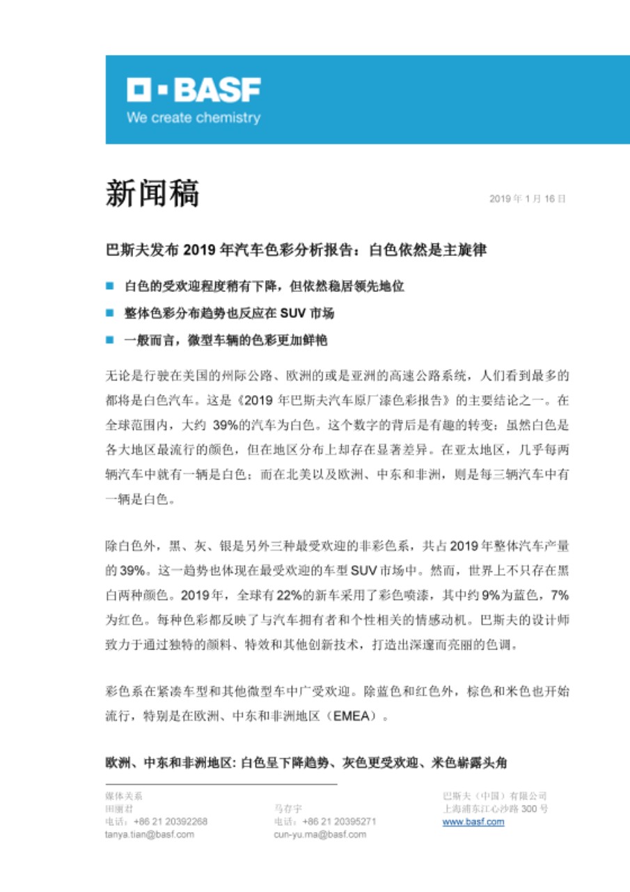 巴斯夫发布2019年汽车色彩分析报告:白色依然是主旋律