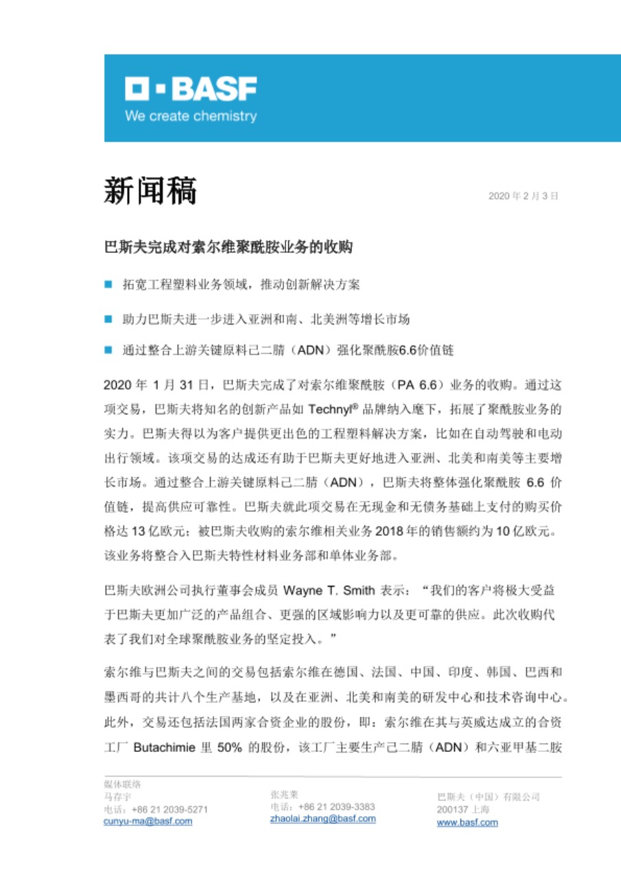 2020年 1月31日,巴斯夫完成了对索尔维聚酰胺(PA 6.6)业务的收购。通过这项交易,巴斯夫将知名的创新产品如Technyl® 品牌纳入麾下,拓展了聚酰胺业务的实力。巴斯夫得以为客户提供更出色的工程塑料解决方案,比如在自动驾驶和电动出行领域。该项交易的达成还有助于巴斯夫更好地进入亚洲、北美和南美等主要增长市场。通过整合上游关键原料己二腈(ADN),巴斯夫将整体强化聚酰胺6.6价值链,提高供应可靠性。巴斯夫就此项交易在无现金和无债务基础上支付的购买价格达13亿欧元;被巴斯夫收购的索尔维相关业务2018年的销售额约为10亿欧元。该业务将整合入巴斯夫特性材料业务部和单体业务部。