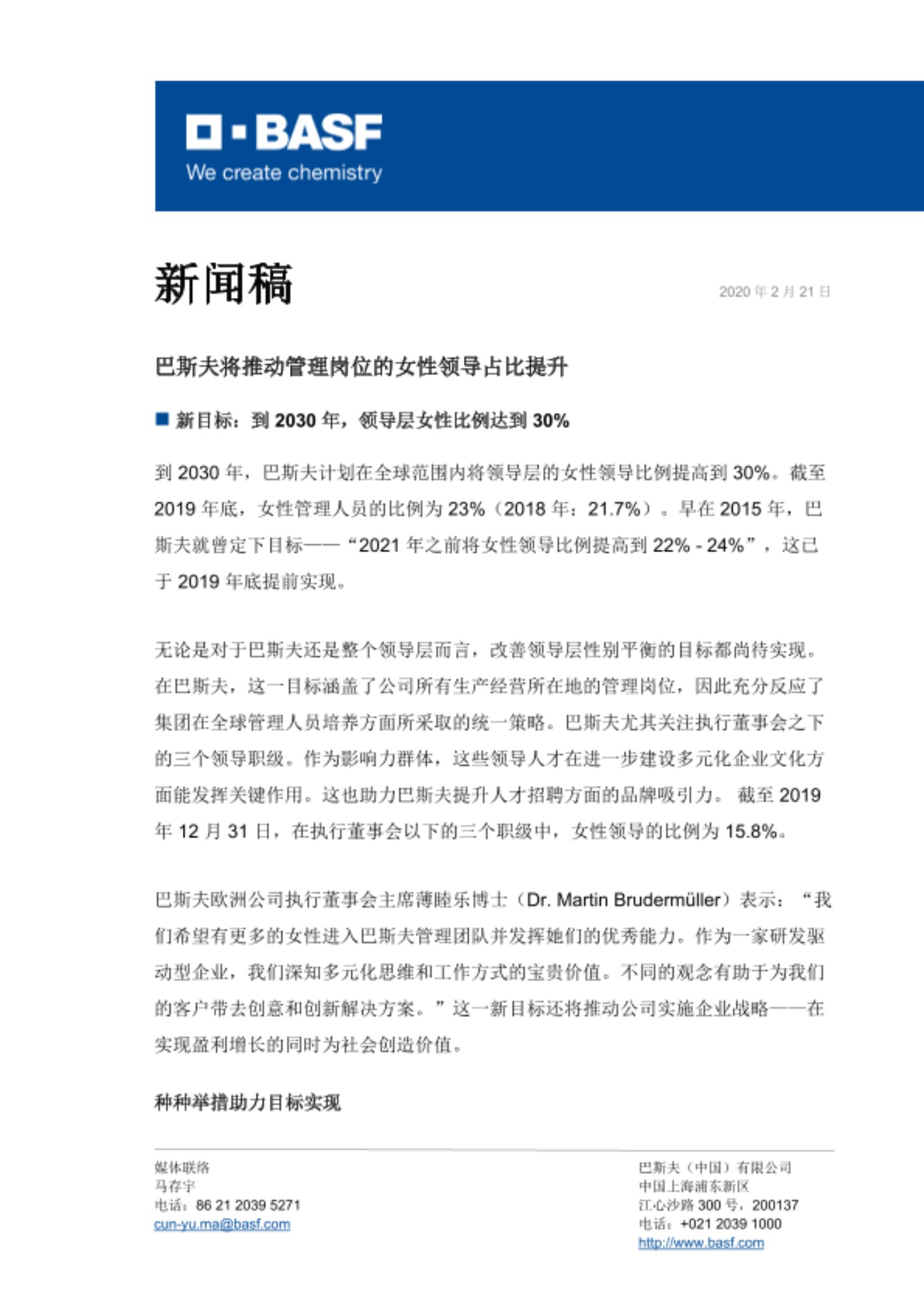 巴斯夫欧洲公司执行董事会主席薄睦乐博士(Dr. Martin Brudermüller)表示:“我们希望有更多的女性进入巴斯夫管理团队并发挥她们的优秀能力。作为一家研发驱动型企业,我们深知多元化思维和工作方式的宝贵价值。不同的观念有助于为我们的客户带去创意和创新解决方案。”这一新目标还将推动公司实施企业战略——在实现盈利增长的同时为社会创造价值。