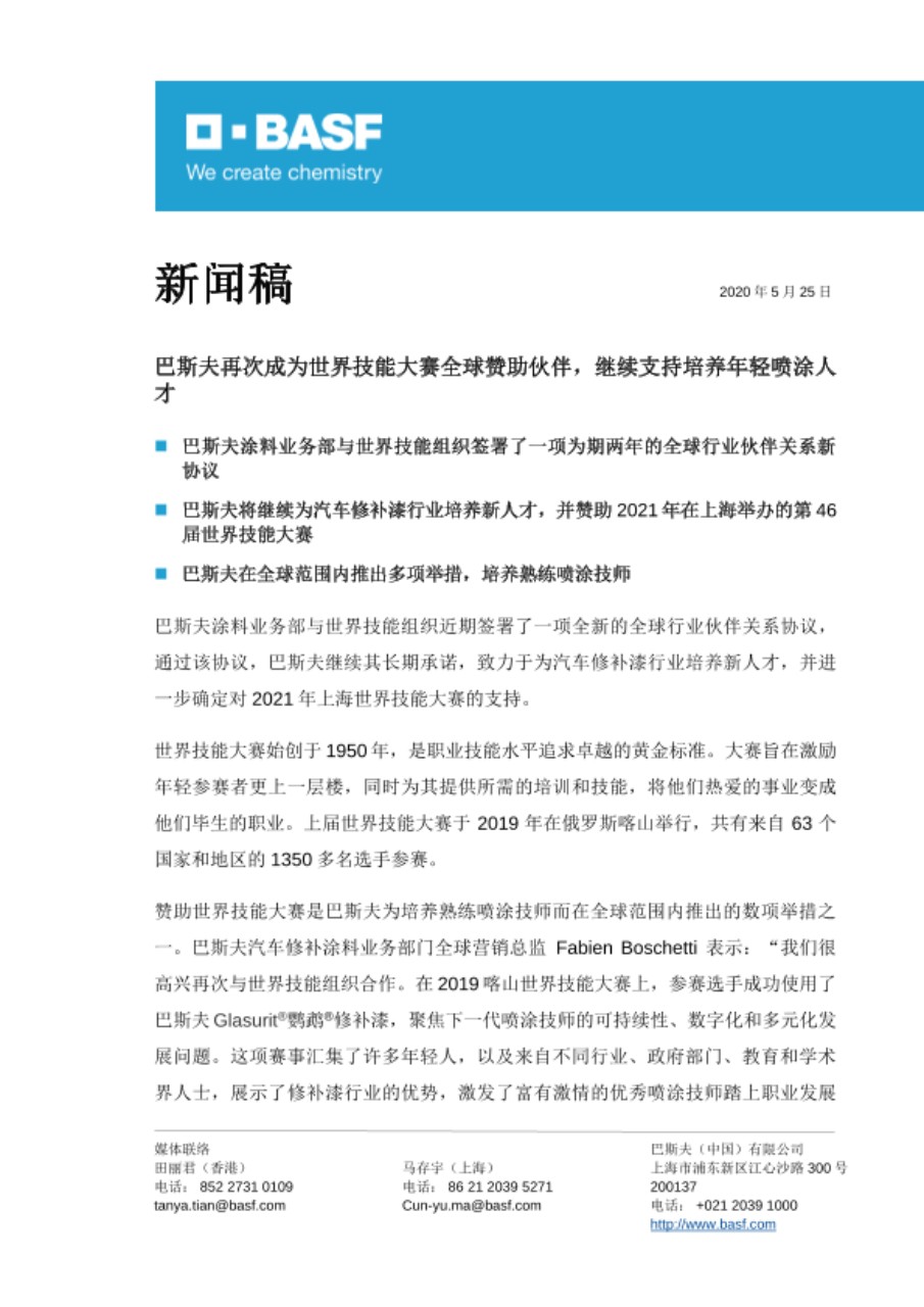 - 巴斯夫将继续为汽车修补漆行业培养新人才,并赞助2021年在上海举办的第46届世界技能大赛