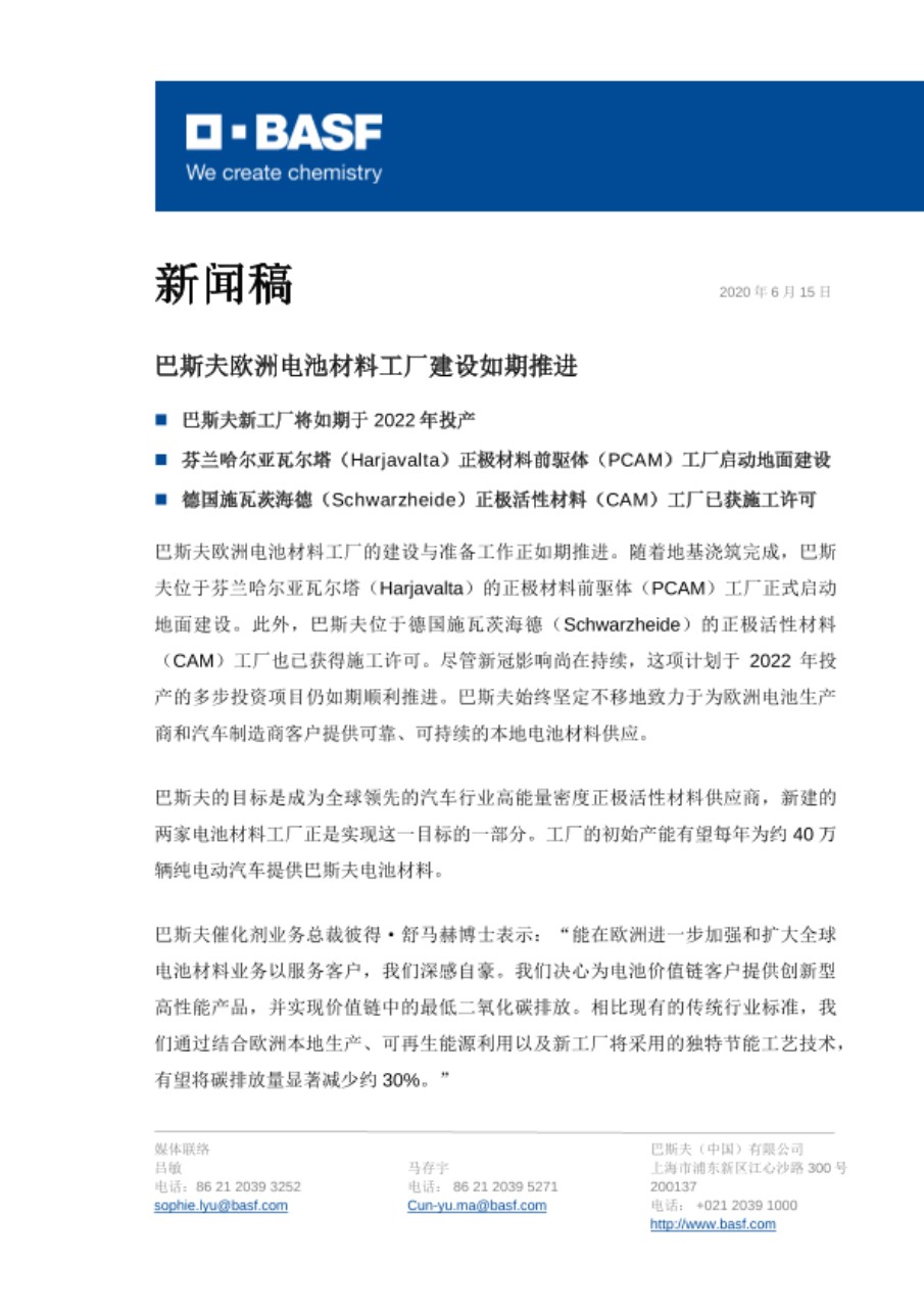 欲获取更多关于巴斯夫电池材料以及巴斯夫致力于电动汽车的信息,请访问巴斯夫网站: