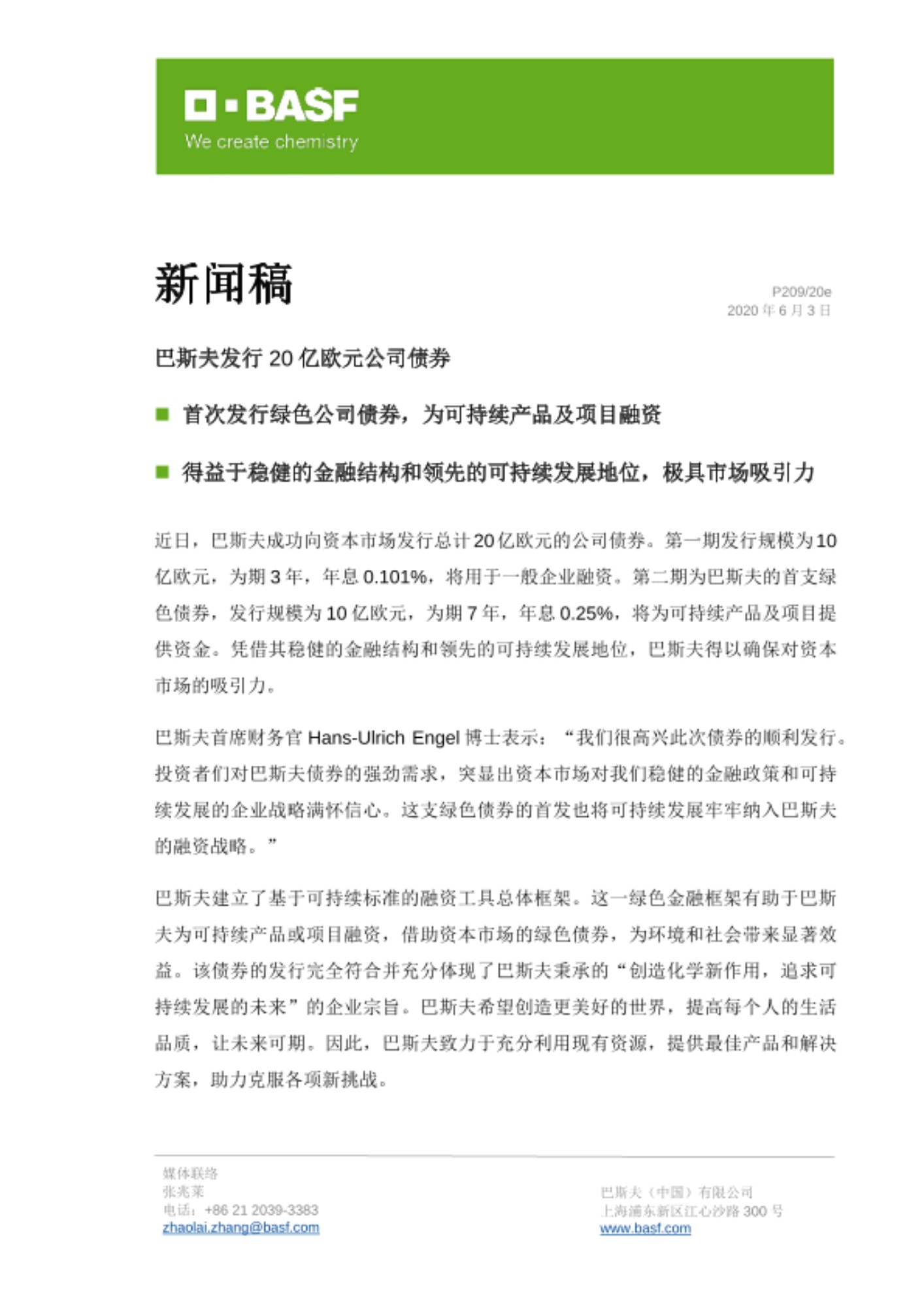 巴斯夫首席财务官Hans-Ulrich Engel博士表示:“我们很高兴此次债券的顺利发行。投资者们对巴斯夫债券的强劲需求,突显出资本市场对我们稳健的金融政策和可持续发展的企业战略满怀信心。这支绿色债券的首发也将可持续发展牢牢纳入巴斯夫的融资战略。”
