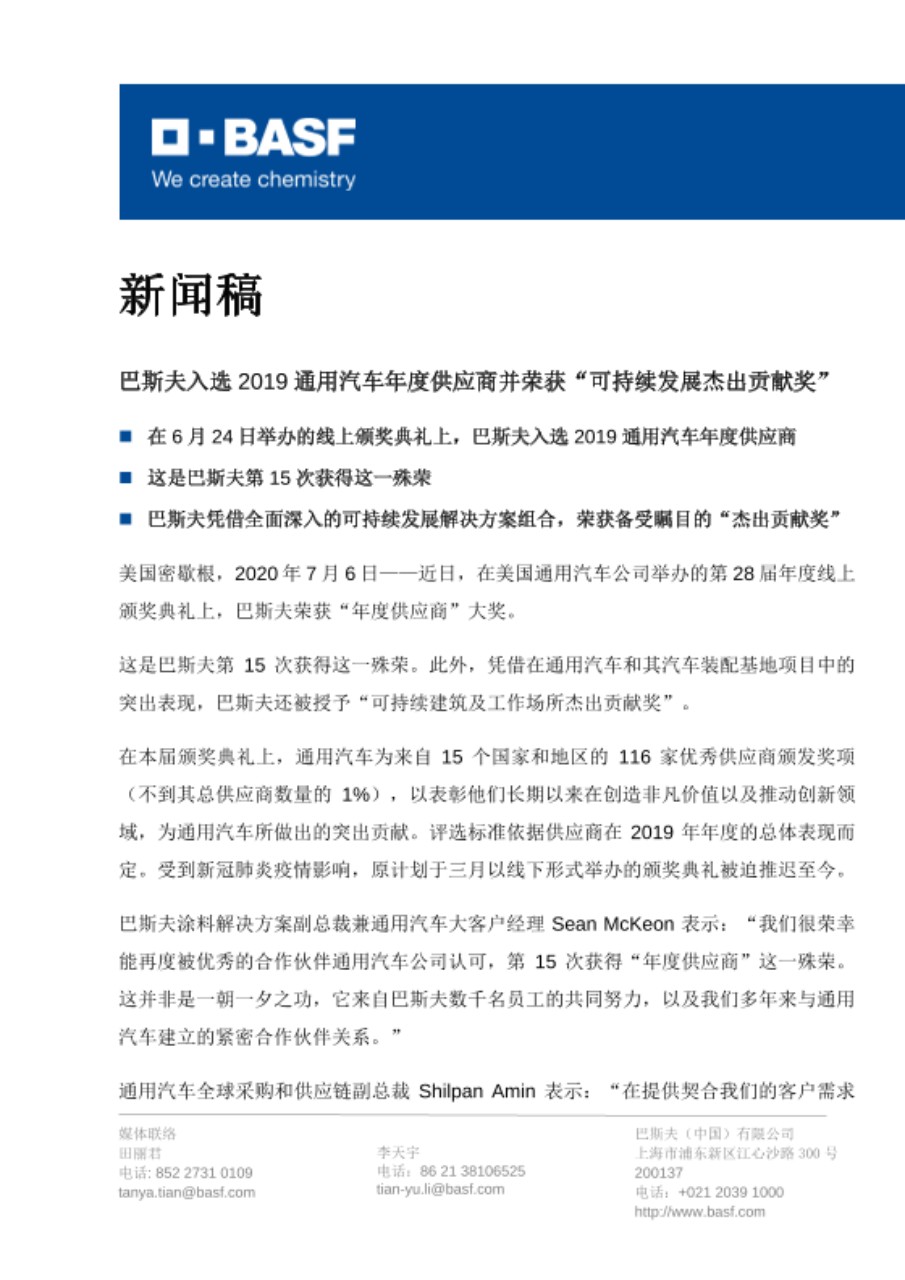 - 在6月24日举办的线上颁奖典礼上,巴斯夫入选2019通用汽车年度供应商