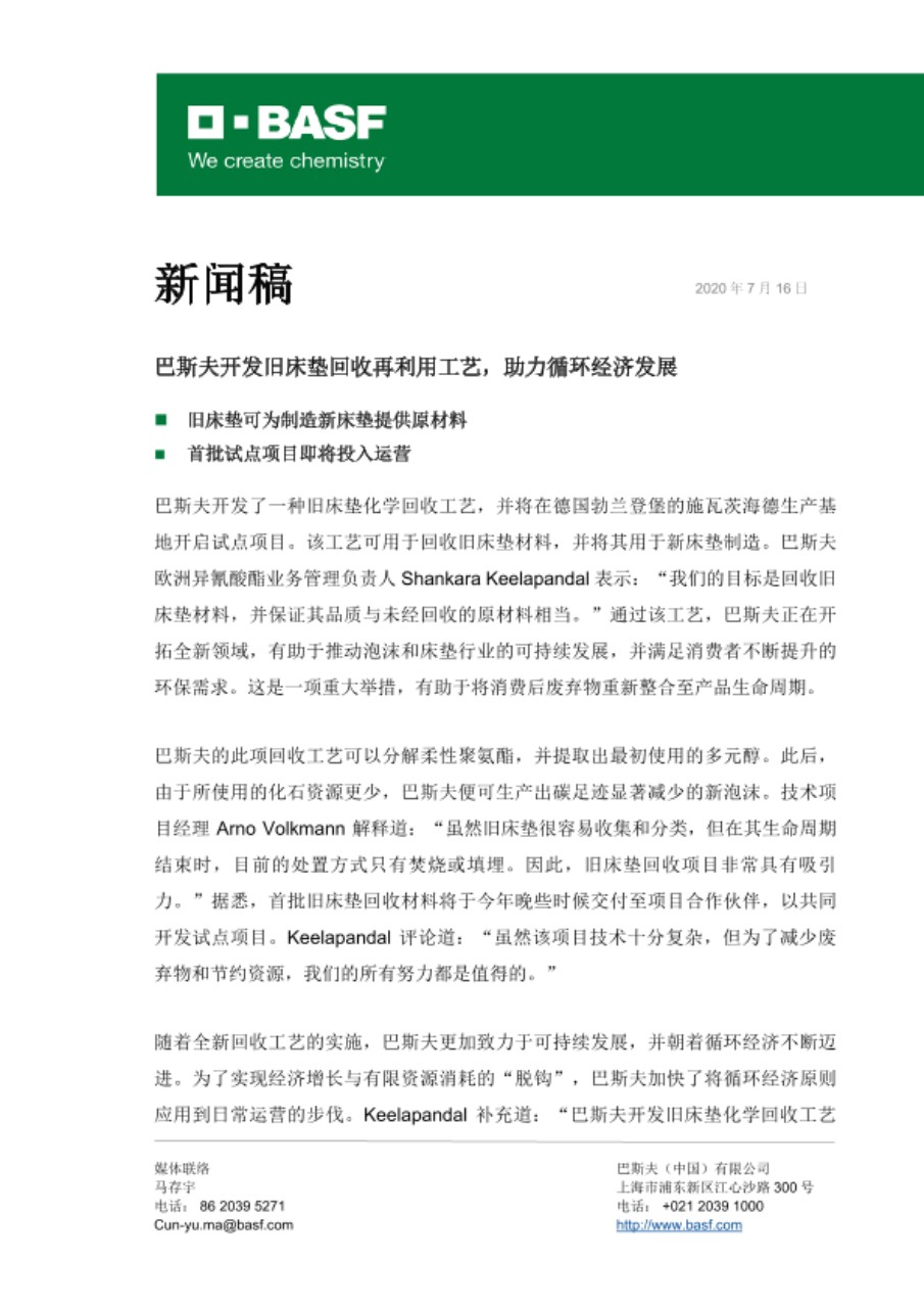 巴斯夫开发旧床垫回收再利用工艺,助力循环经济发展