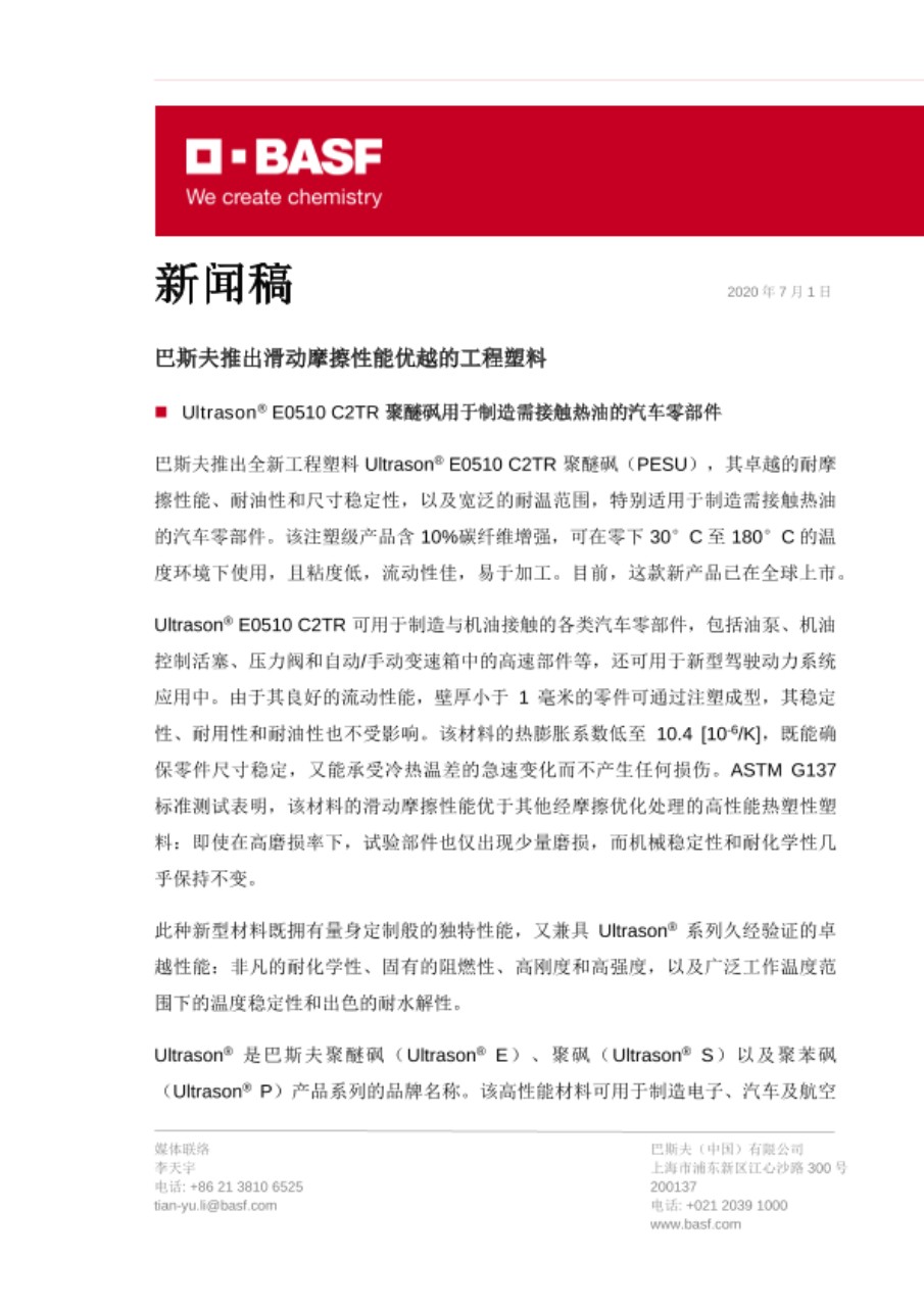 巴斯夫推出全新工程塑料 Ultrason® E0510 C2TR 聚醚砜(PESU),其卓越的耐摩擦性能、耐油性和尺寸稳定性,以及宽泛的耐温范围,特别适用于制造需接触热油的汽车零部件。该注塑级产品含10%碳纤维增强,可在零下30°C至180°C的温度环境下使用,且粘度低,流动性佳,易于加工。目前,这款新产品已在全球上市。