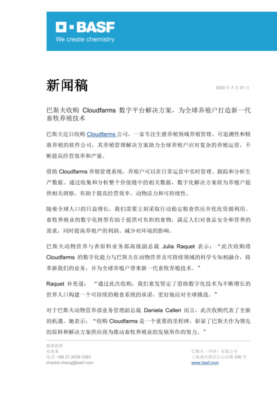 巴斯夫动物营养与香原料业务部高级副总裁Julia Raquet表示:“此次收购将Cloudfarms的数字化能力与巴斯夫在动物营养及可持续领域的科学专知相融合,将革新我们的业务,并为全球养殖户带来新一代畜牧养殖技术。”