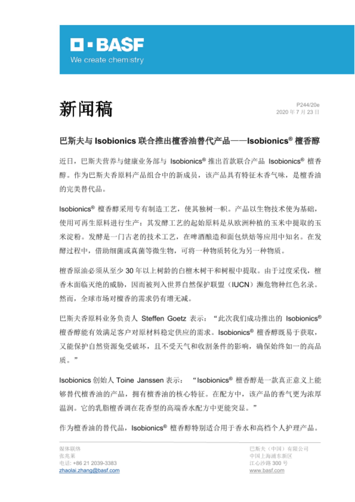 近日,巴斯夫营养与健康业务部与Isobionics® 推出首款联合产品Isobionics® 檀香醇。作为巴斯夫香原料产品组合中的新成员,该产品具有特征木香气味,是檀香油的完美替代品。