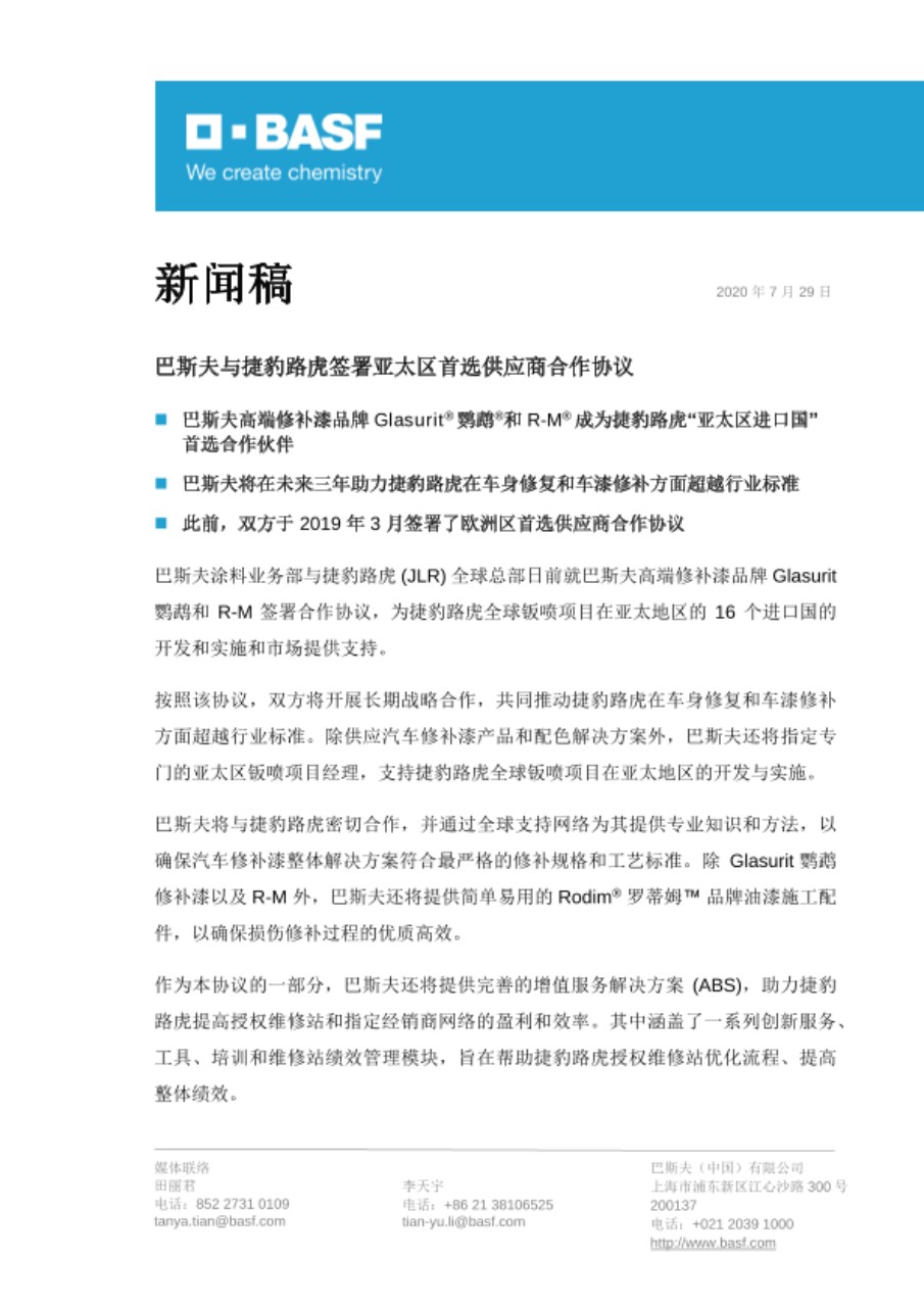 巴斯夫与捷豹路虎签署亚太区首选供应商合作协议