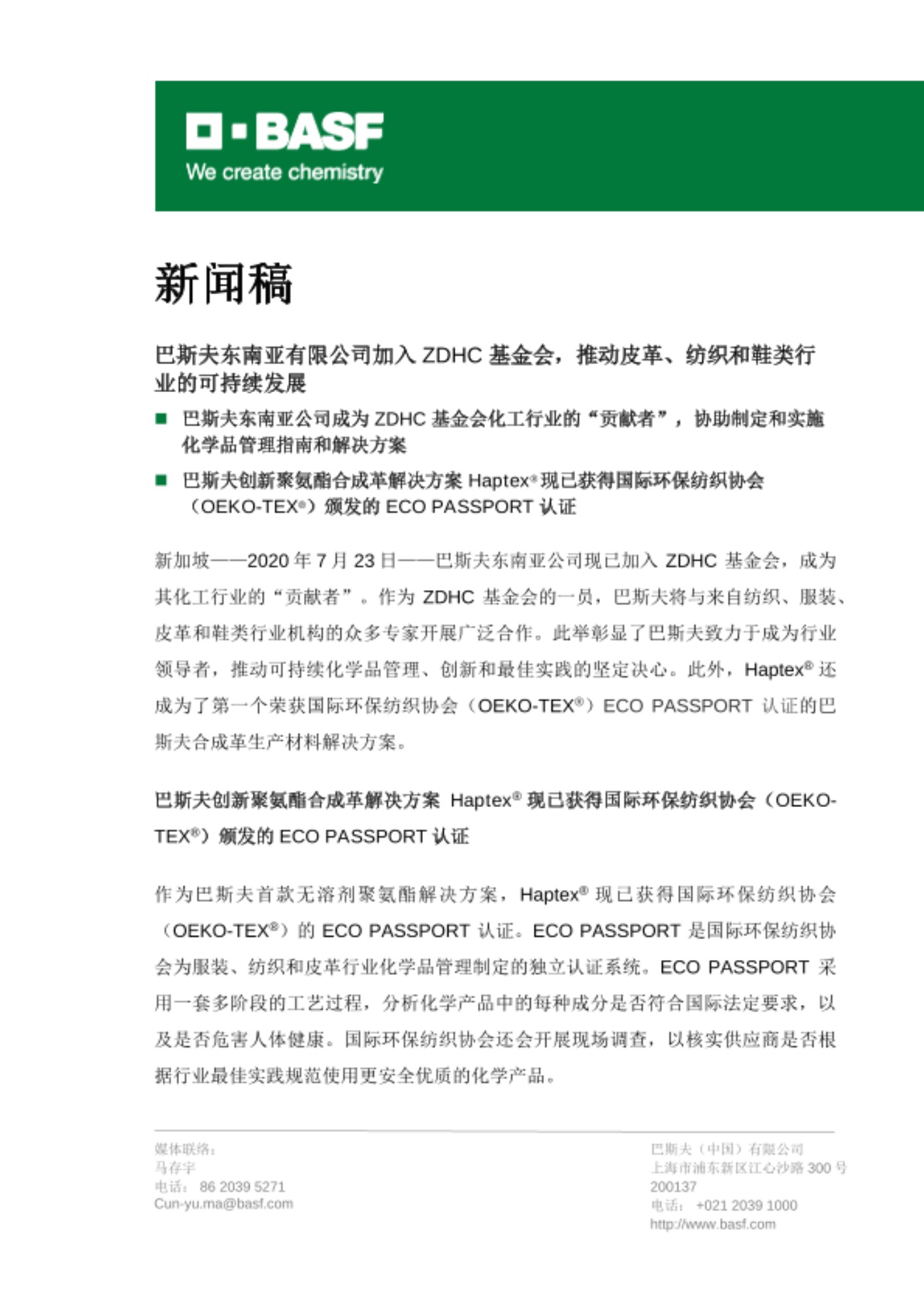 新加坡——2020年7月23日——巴斯夫东南亚公司现已加入 ZDHC 基金会,成为其化工行业的“贡献者”。作为 ZDHC 基金会的一员,巴斯夫将与来自纺织、服装、皮革和鞋类行业机构的众多专家开展广泛合作。此举彰显了巴斯夫致力于成为行业领导者,推动可持续化学品管理、创新和最佳实践的坚定决心。此外,Haptex® 还成为了第一个荣获国际环保纺织协会(OEKO-TEX®)ECO PASSPORT 认证的巴斯夫合成革生产材料解决方案。